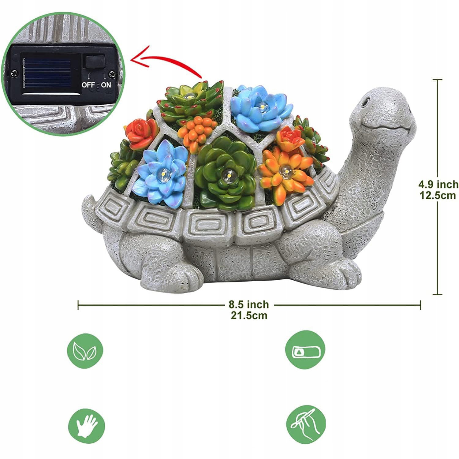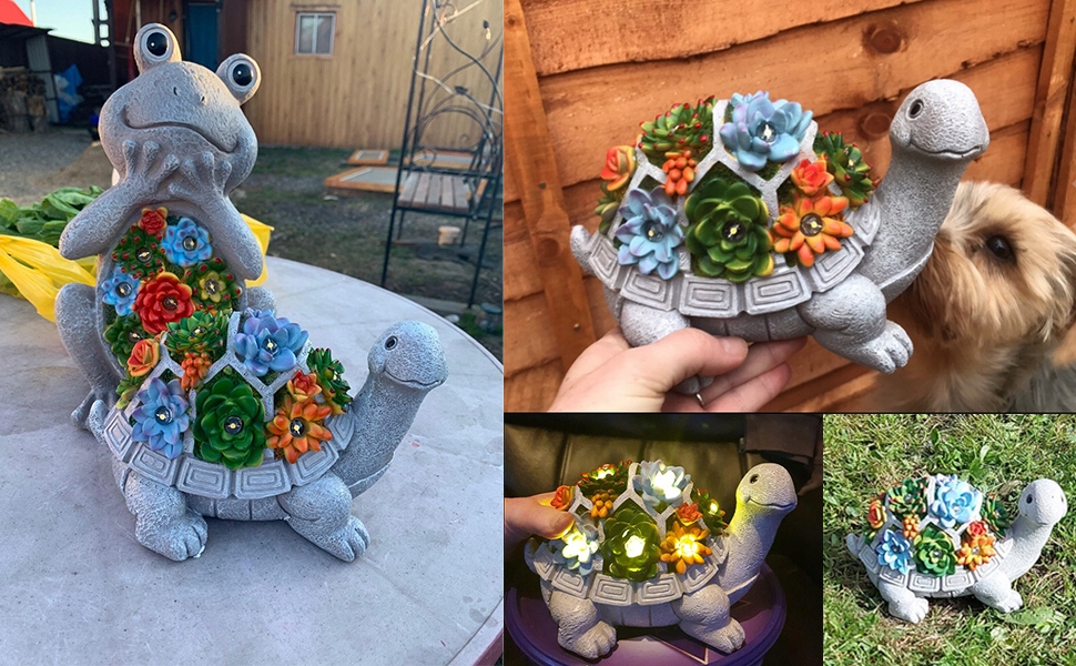 Эта очаровательная смоляная черепаха с одной стороны имеет красочную, солнечную лампу в форме суккулентной и на другой солнечной панели. Это будет очаровательное дополнение к вашему саду или комнате и даст вашему дому радостный характер.