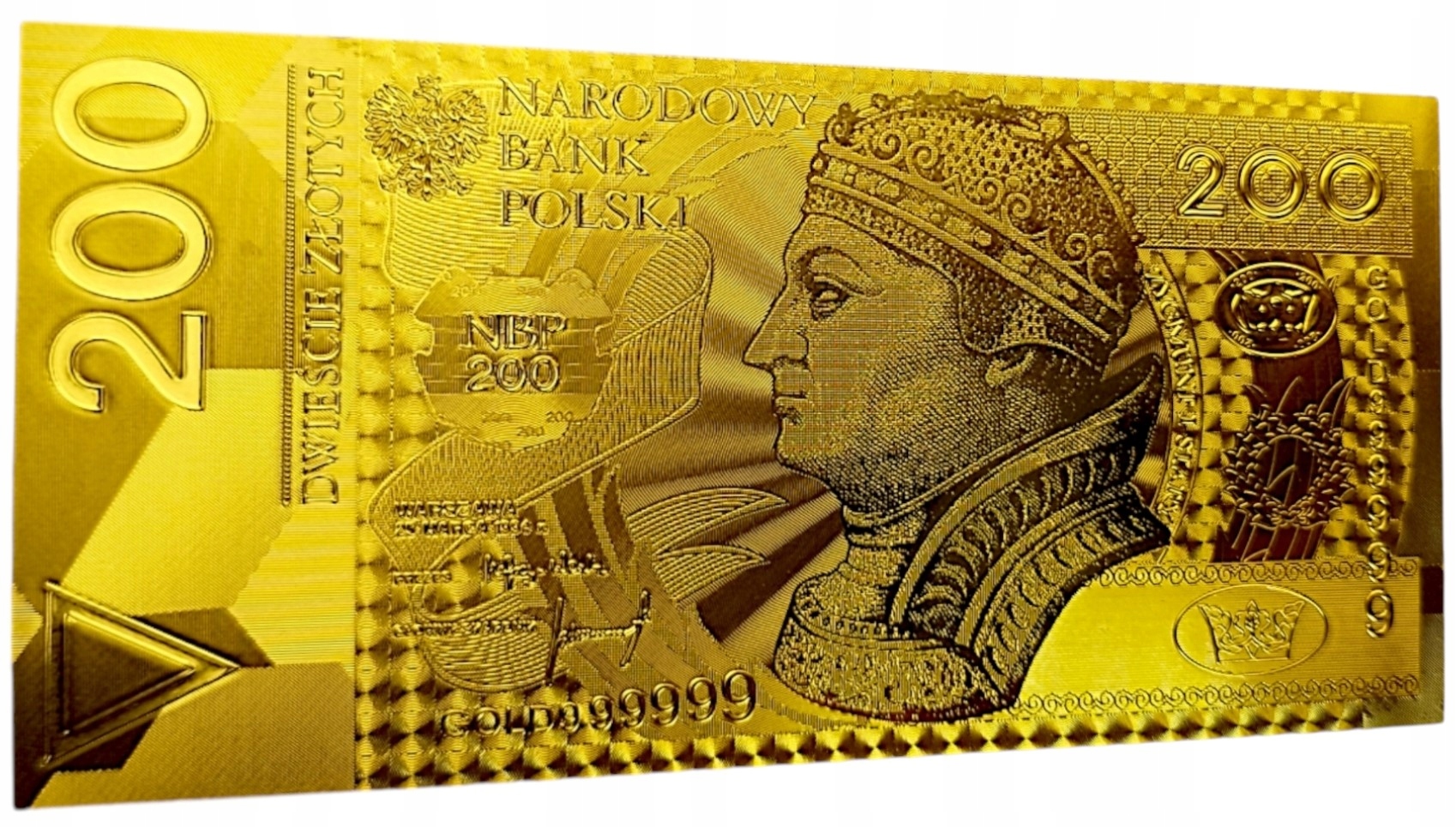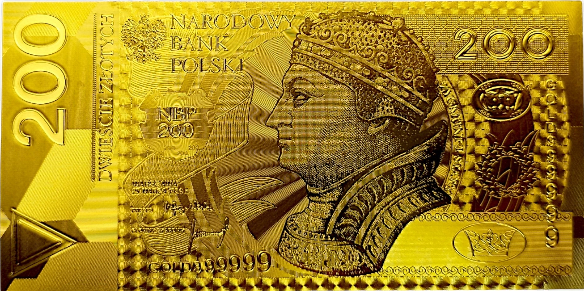 ЗИГМУНТ И СТАРАЯ Уникальная банкнота номиналом 200 злотых из позолоченного ПВХ, ЗОЛОТАЯ ВЕРСИЯ