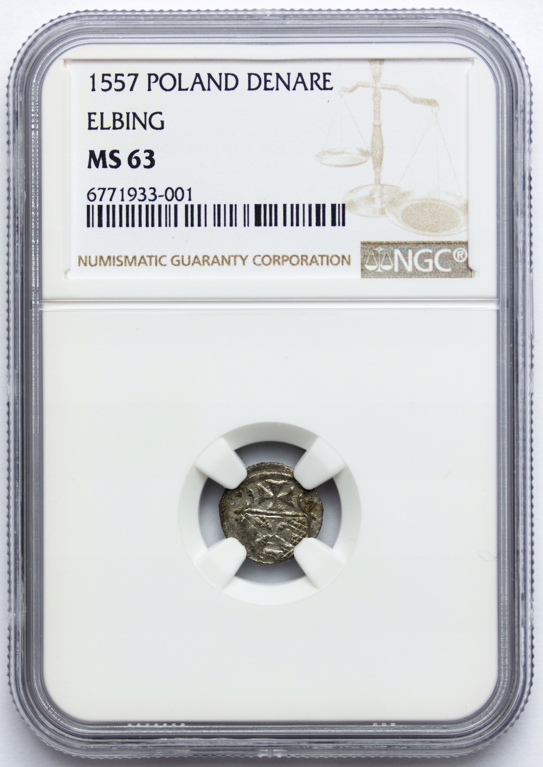 Зигмунт II Август, денар 1557, Ельблонг, NGC MS63, MAX NOTA, КРАСИВИЙ