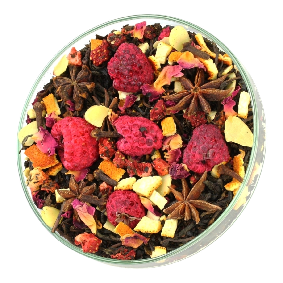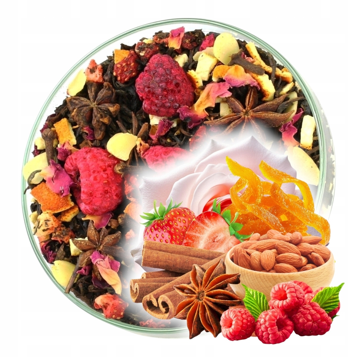 Состав: Чай черный, анис, цедра апельсина, МИНДАЛЬ, гвоздика, корица, лепестки розы, клубника сублимированная, малина, ароматизатор.