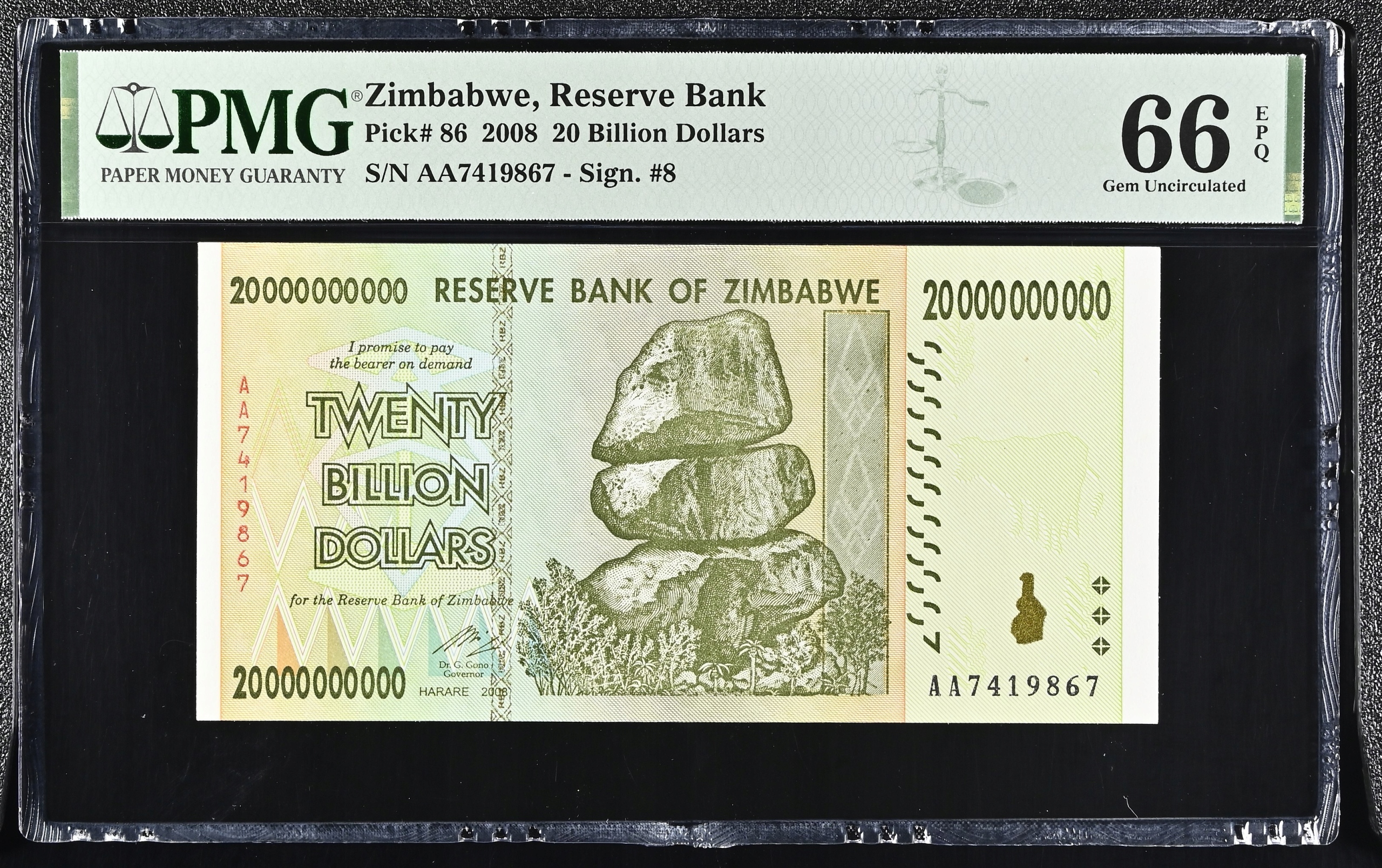 Зімбабве 20 мільярдів доларів 2008 року P-86 UNC PMG 66