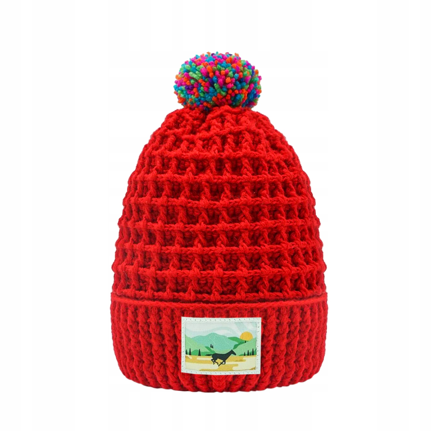 Шляпа красным цветом с красочным помпоном. Спереди, оригинальное пятно, показывающее бегущую лошадь на фоне гор.
