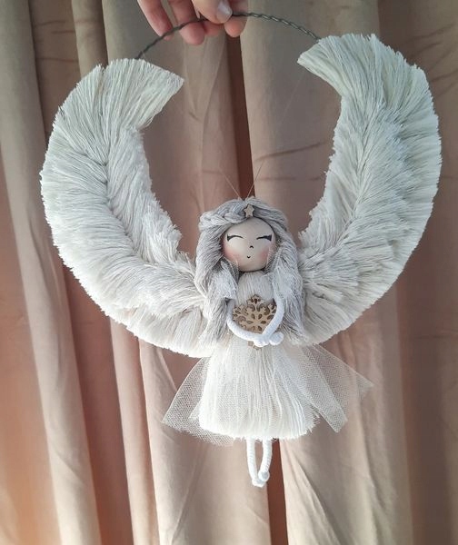 Ангел со снежинками на металлическом ободе с декоративными крыльями будет красивым украшением вашего дома.