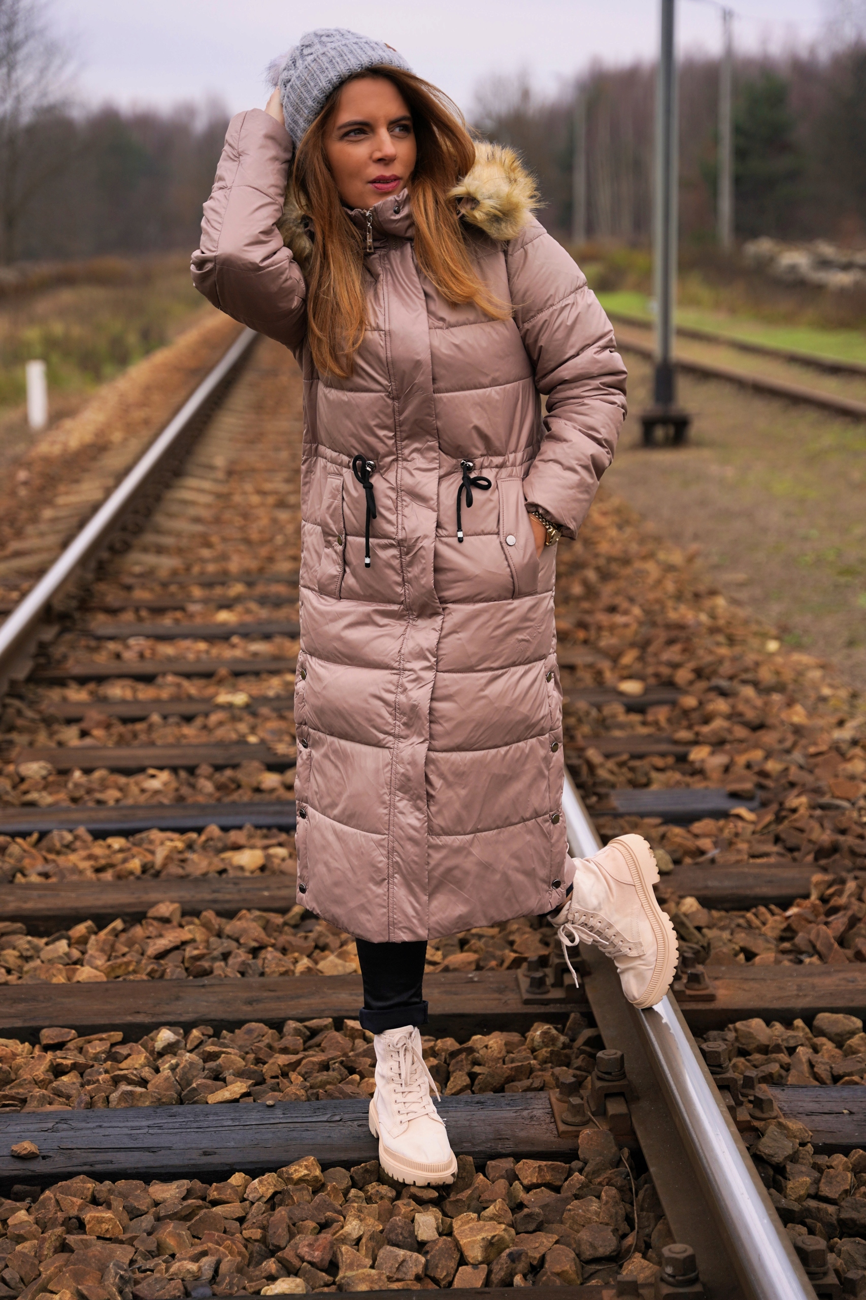 ДЛИННОЕ СТЕГАНОЕ ЗИМНЕЕ ПАЛЬТО С КАПЮШОНОМ И СЪЕМНЫМ МЕХОМ НА КАПЮШНЕ;