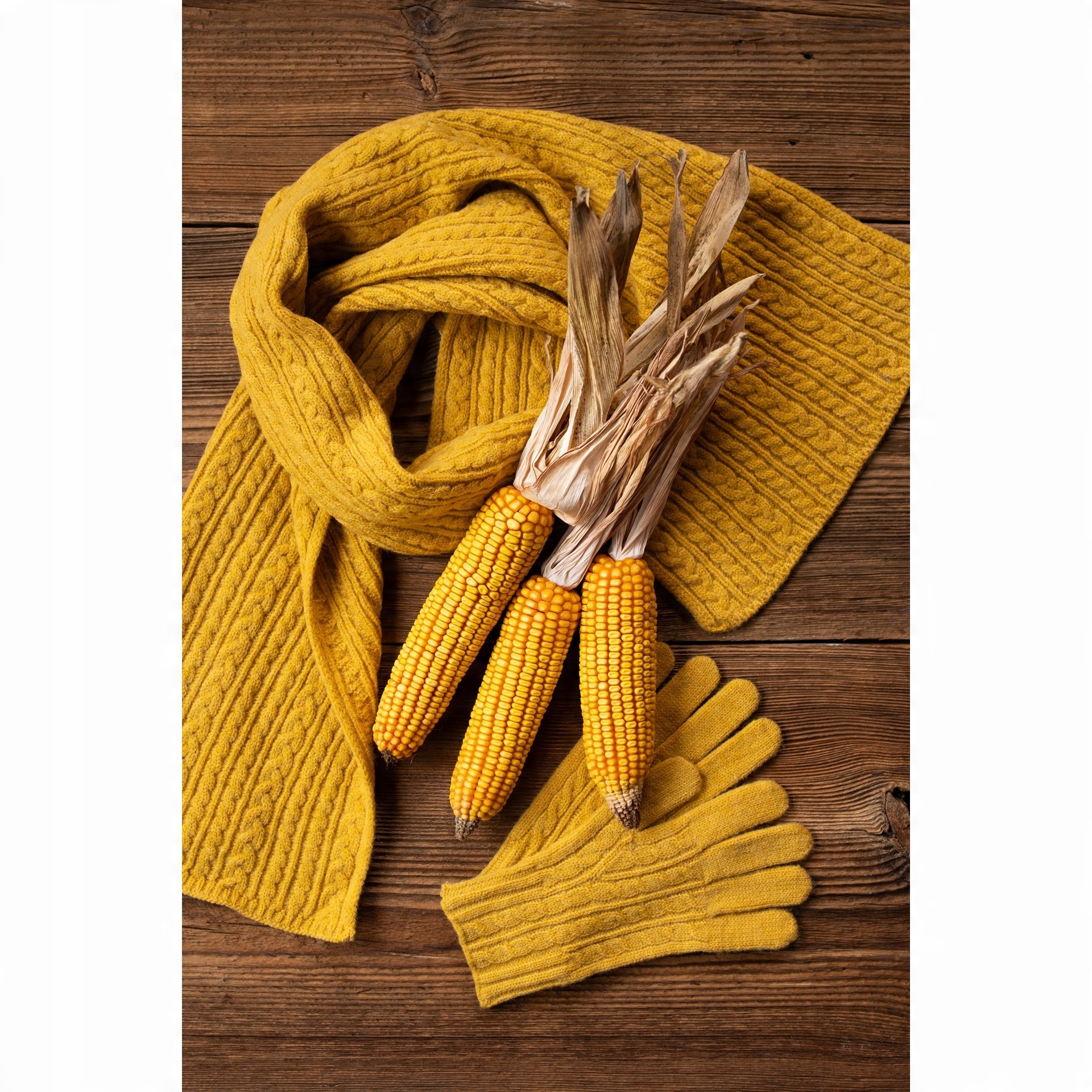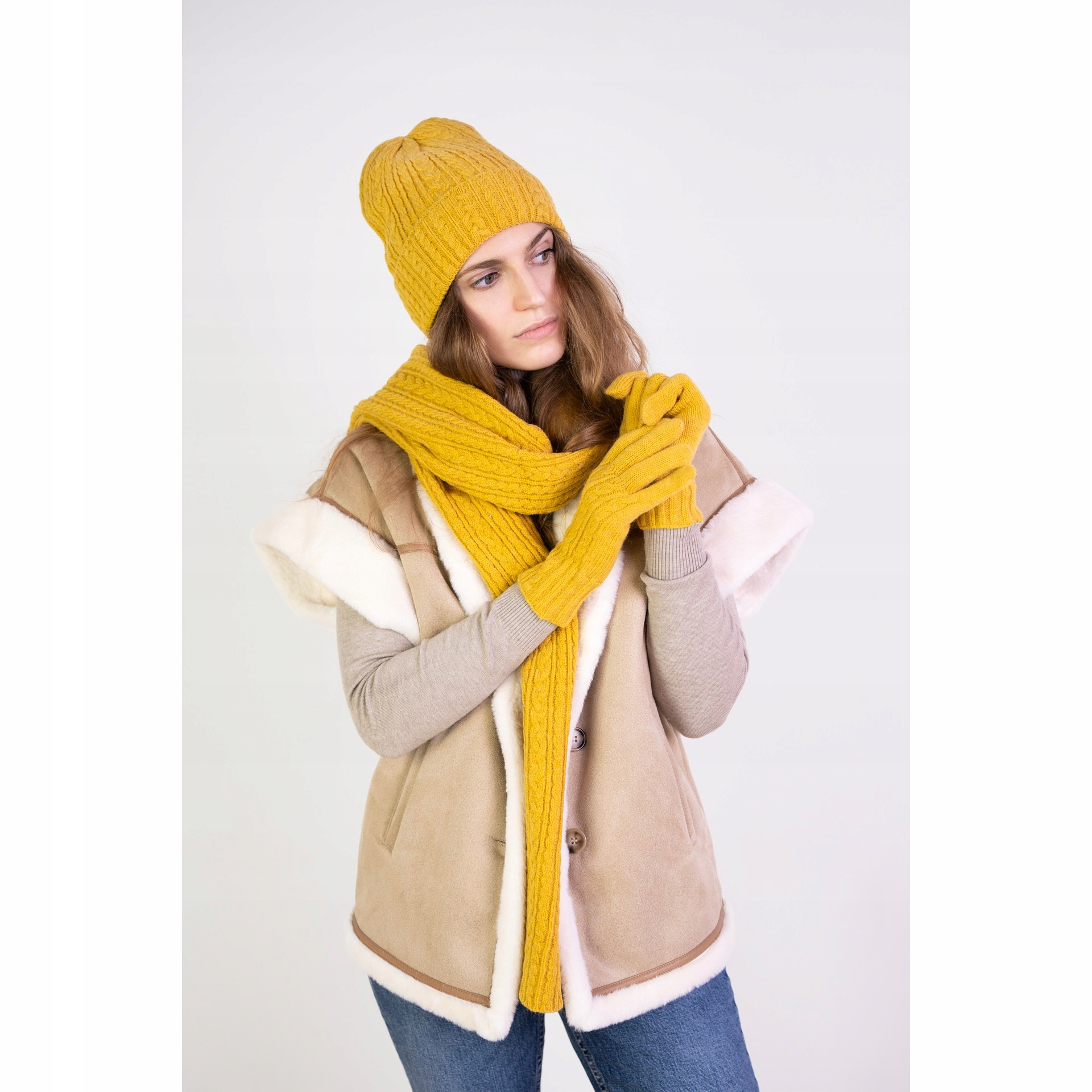 Минималистичный зимний комплект, состоящий из шапки, шарфа и перчаток.