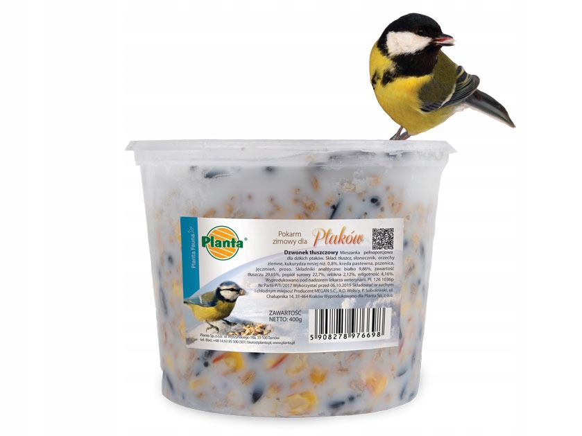 Жирный колокольчик представляет собой смесь зерновых злаков, залитых жиром, приготовленную таким образом, чтобы обеспечить птицам соответствующую дозу энергии в морозные и снежные дни.