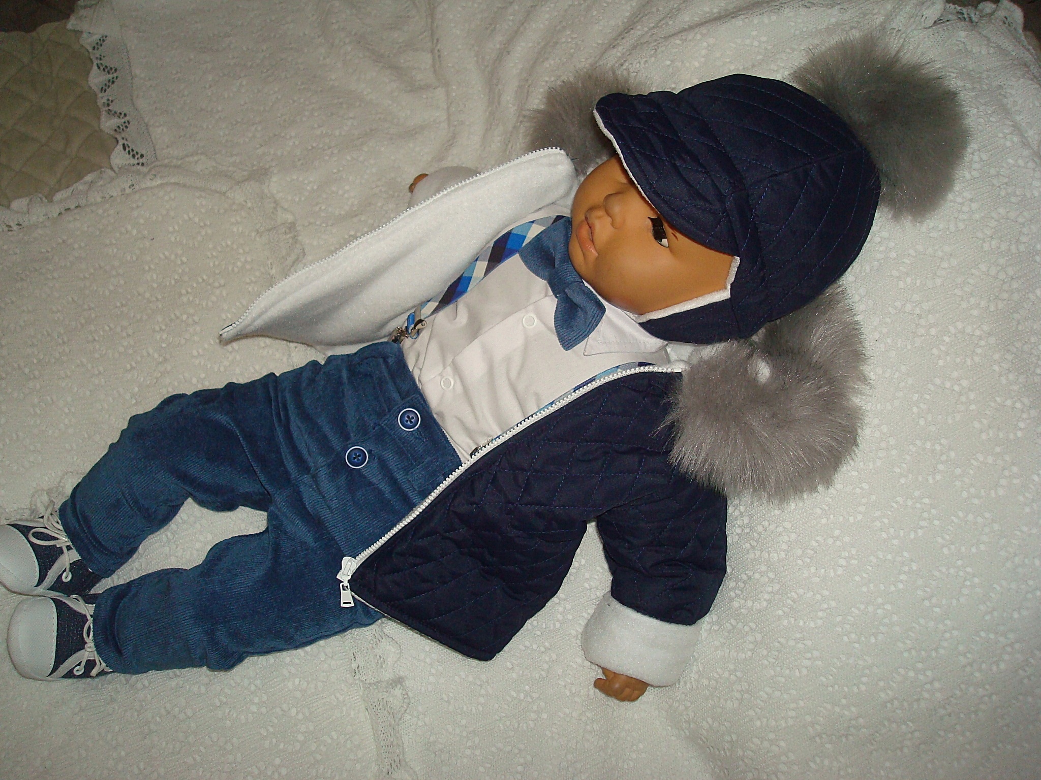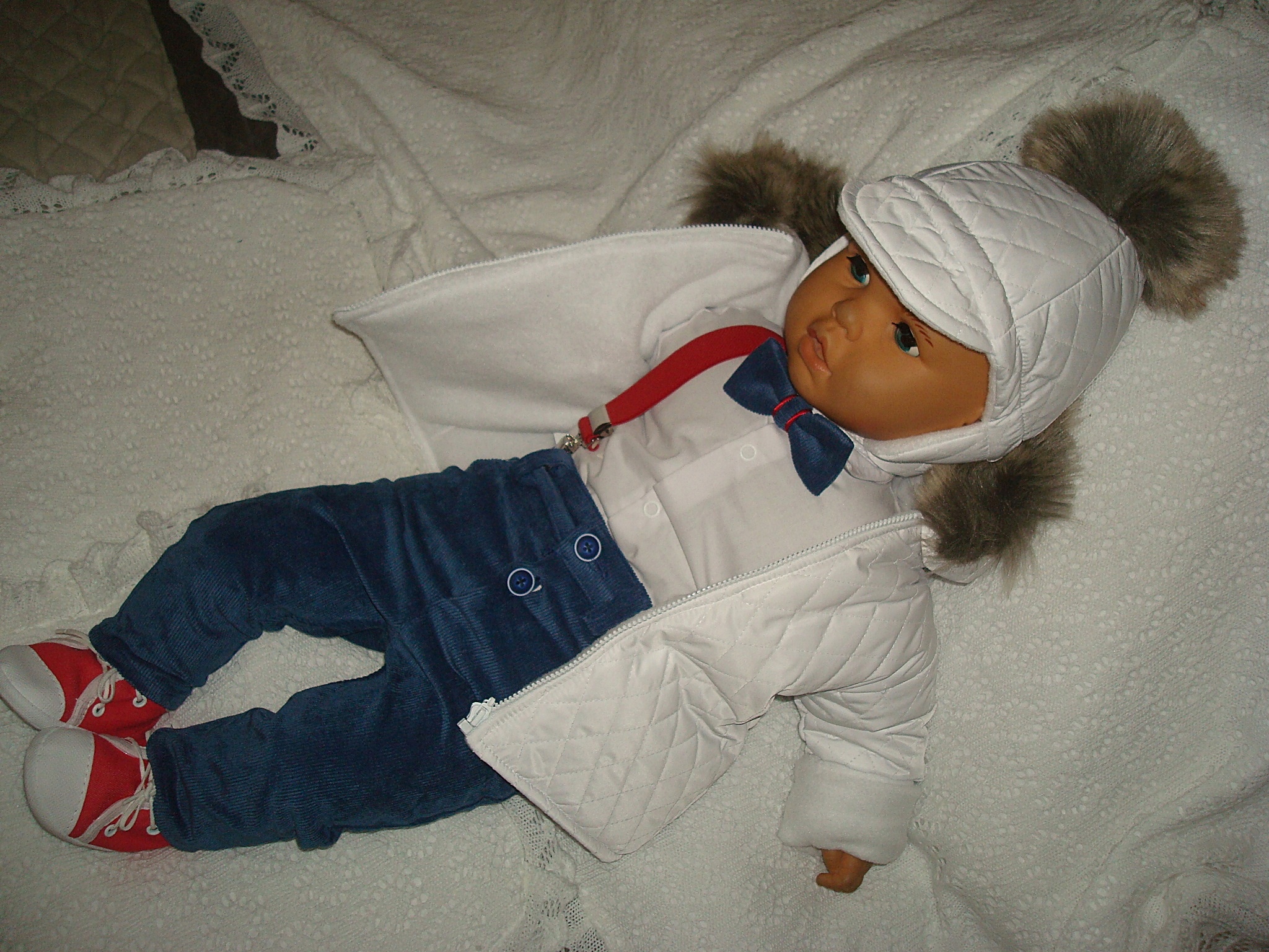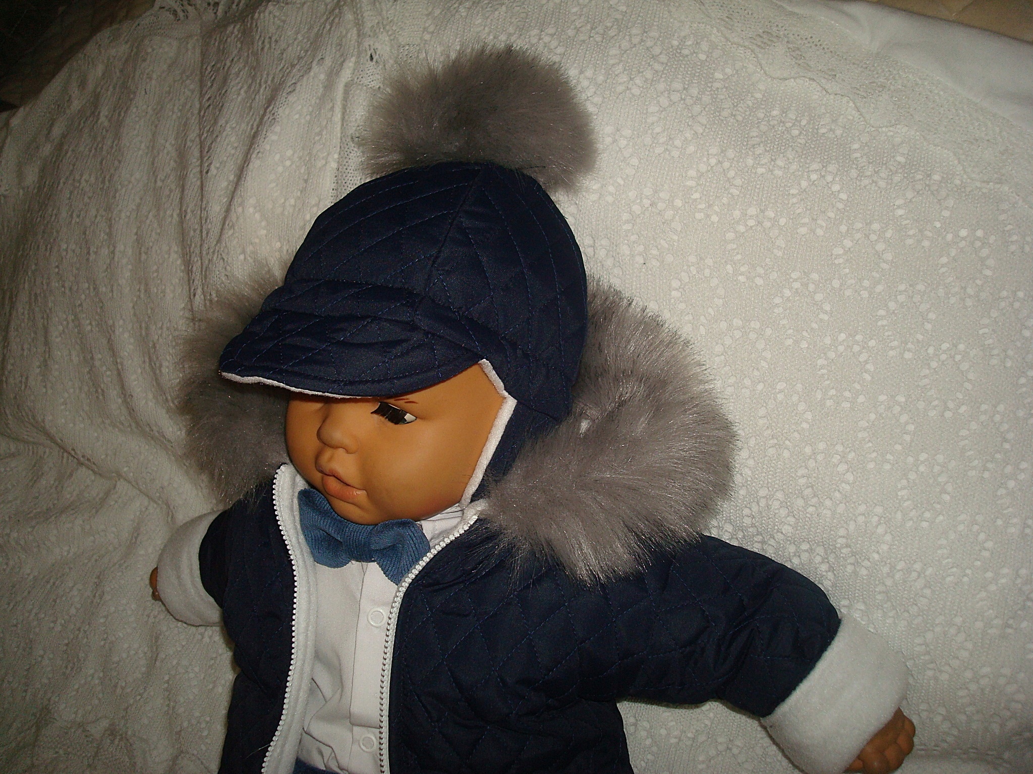 - БЕЛАЯ ИЛИ ТЕМНО-СИНЯЯ УТЕПЛЕННАЯ КУРТКА, СТЕГАНАЯ С ФЛИСОМ, С КАПЮШОНОМ С КРАСИВЫМ МЕХОМ.
