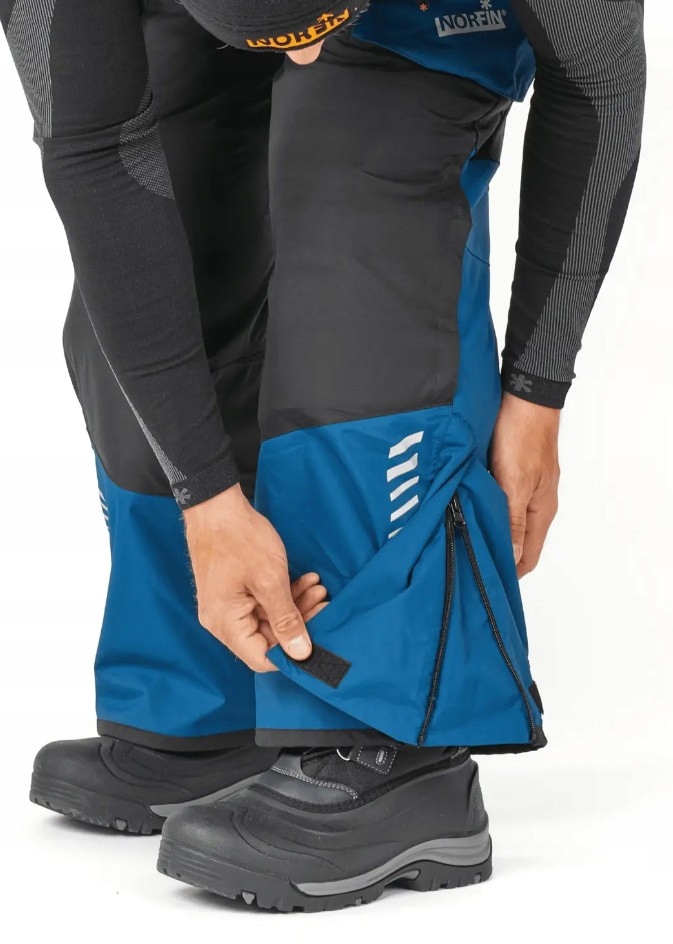 - закрепленным молнией в нижней части брюк с лоскутом, защищающим от снега на