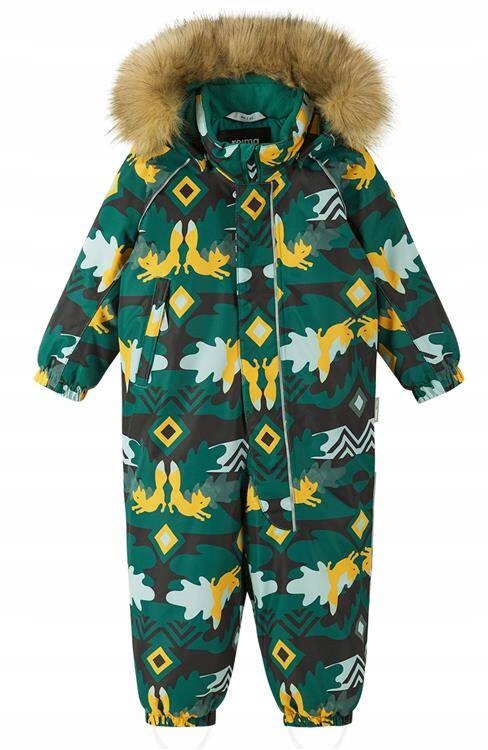Победитель Testing 2021, полностью водонепроницаемый зимний костюм для детей с отпечатками и съемным мехом. С изоляцией на ягодицах и длинным ползунком, который облегчает заправку. Материал: 2441 Reimatec Pro BS GRS 100% переработанный полиэфир, полиуретановое покрытие продукт BlueSign®, подтвержденное основным материалом BlueSign®, подкладкой и изоляцией Floro-Babybolos. recycling