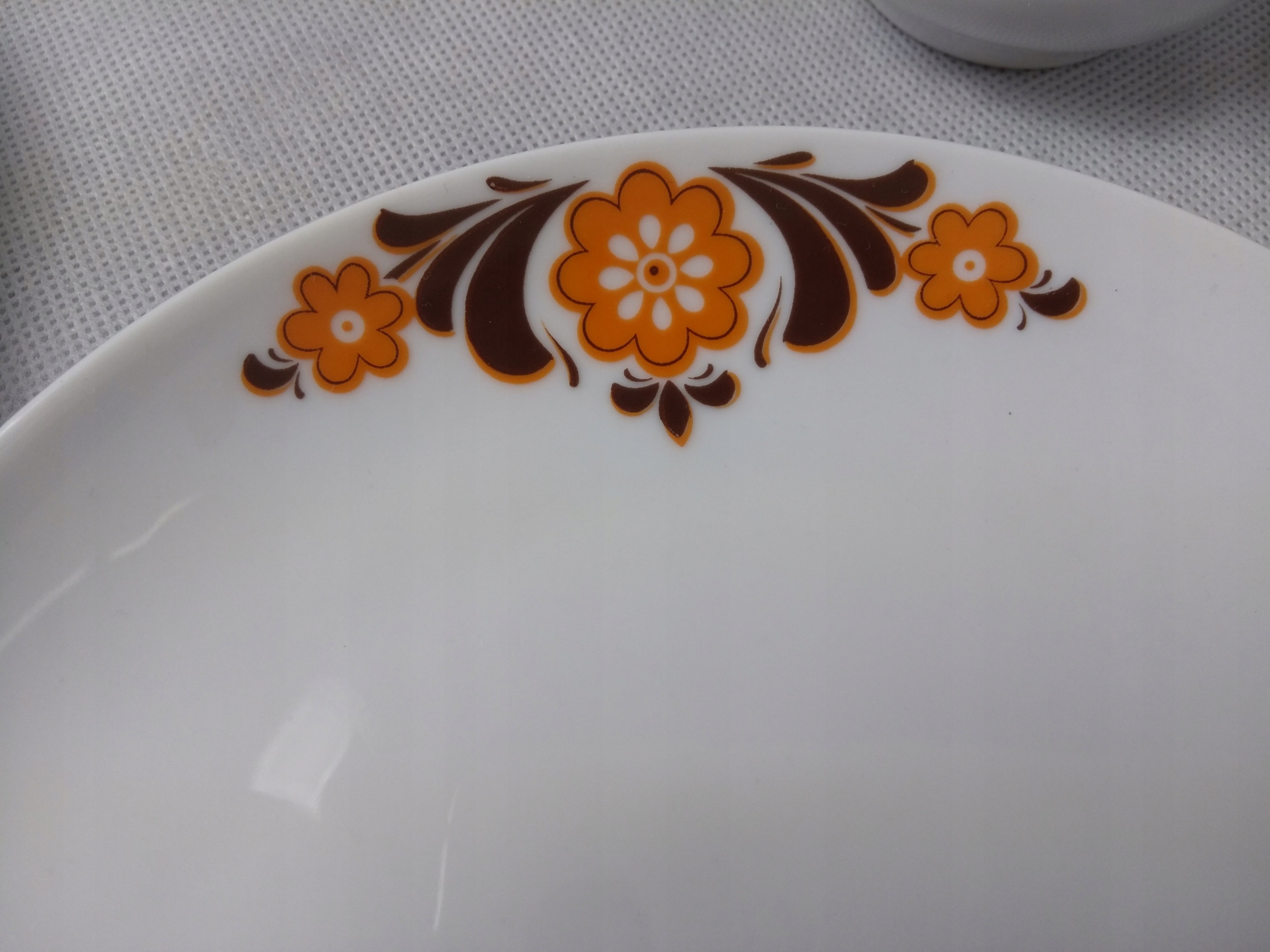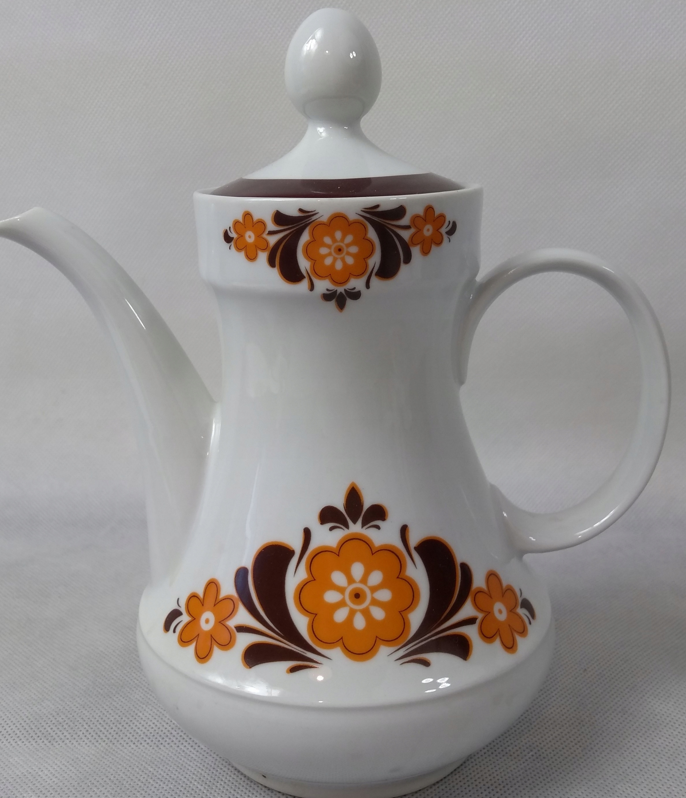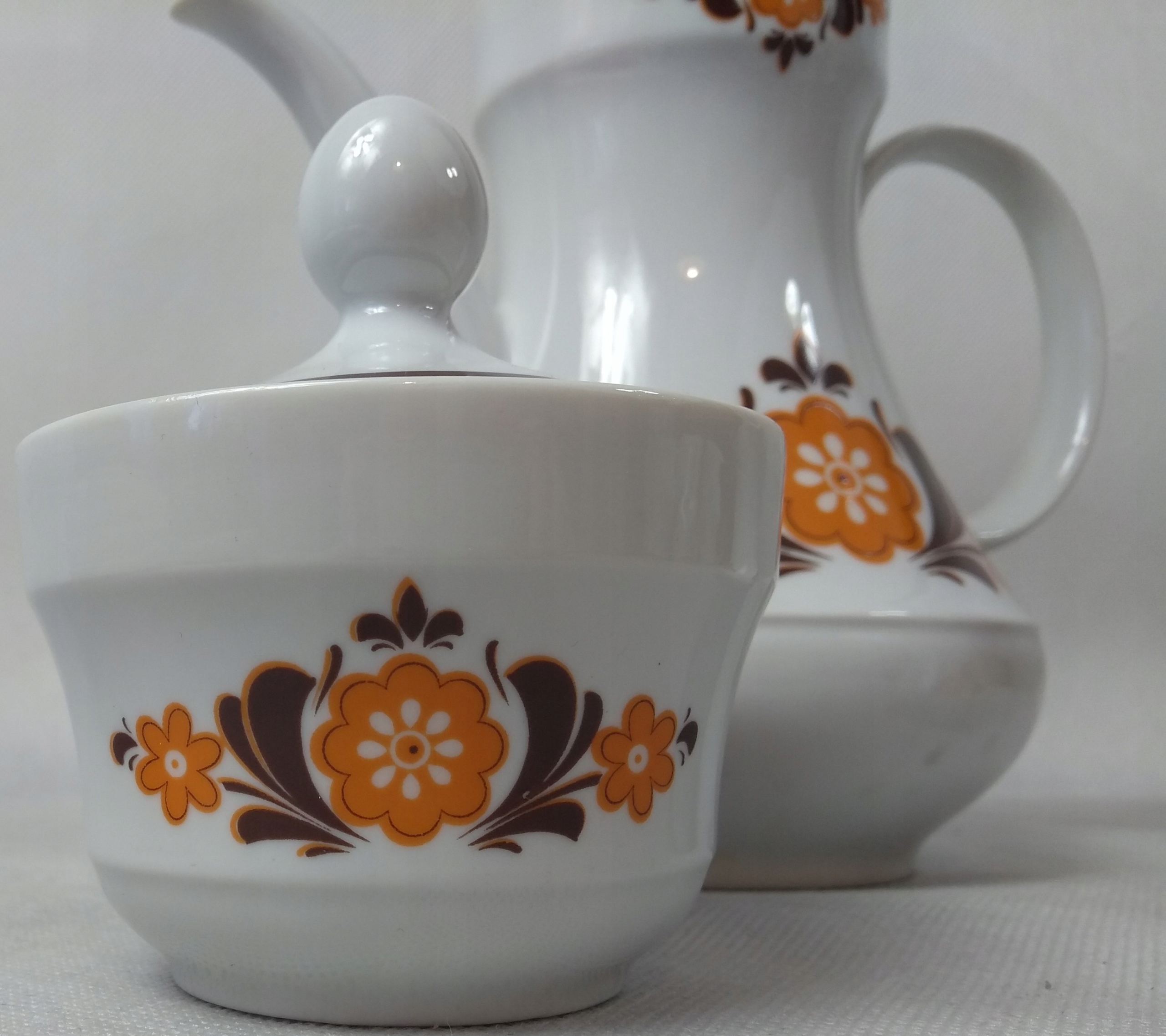 Белый фарфор, украшенный узором оранжевой и коричневой краской.