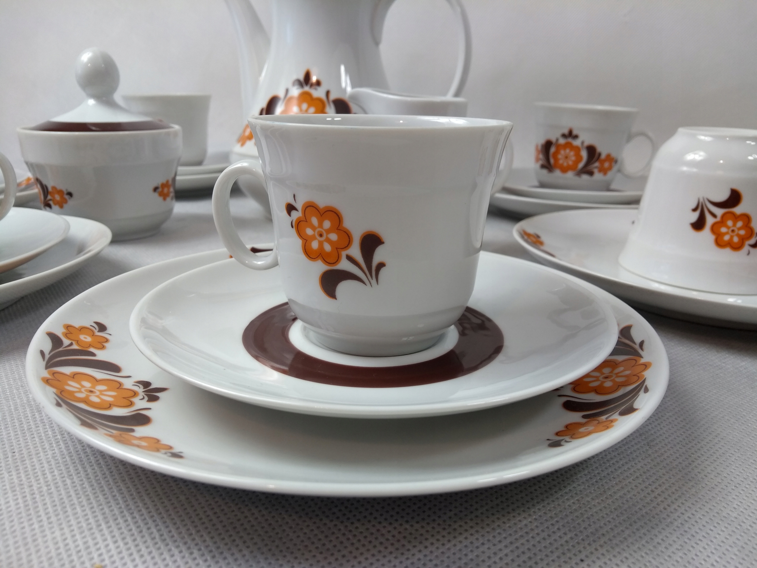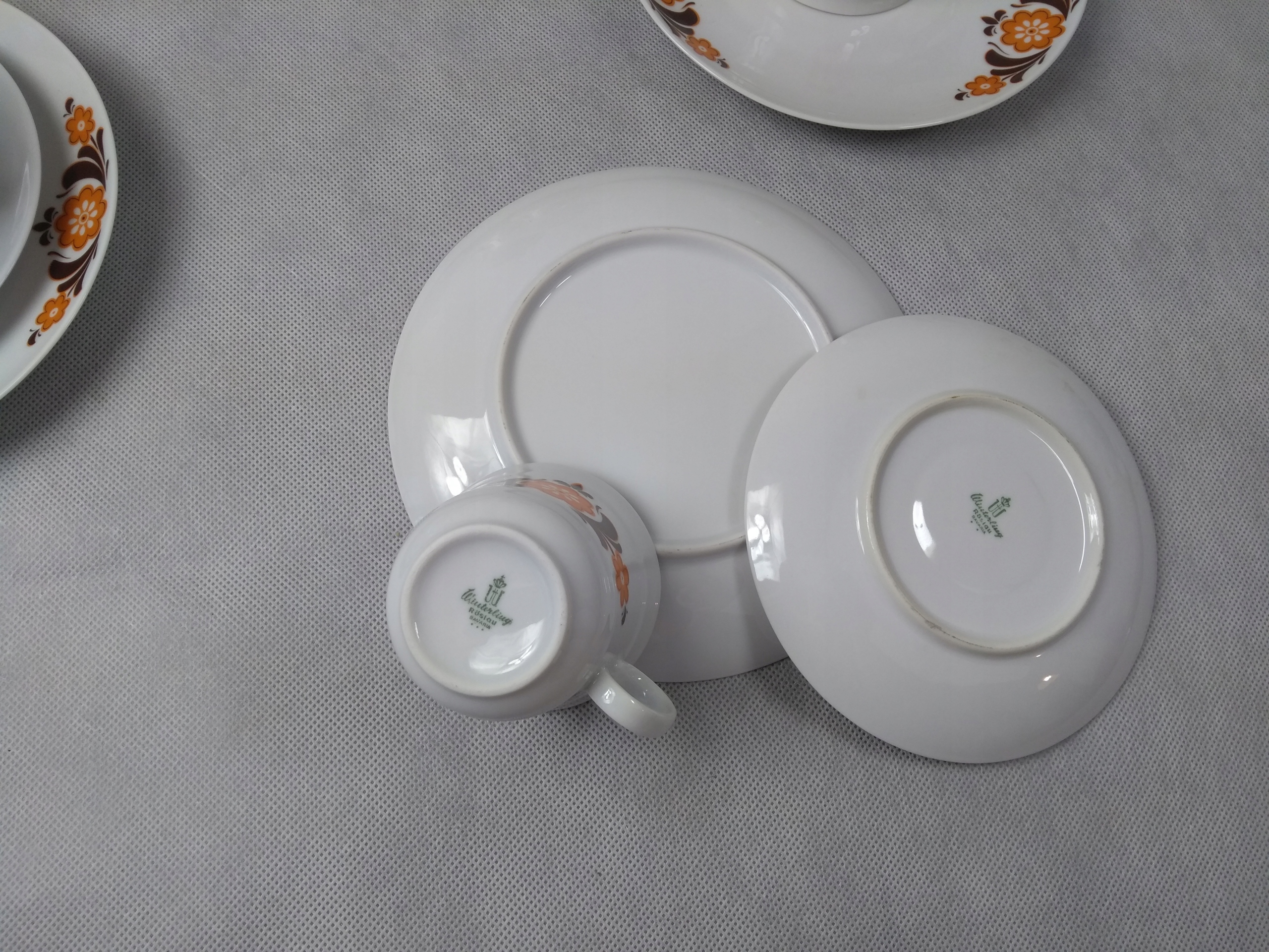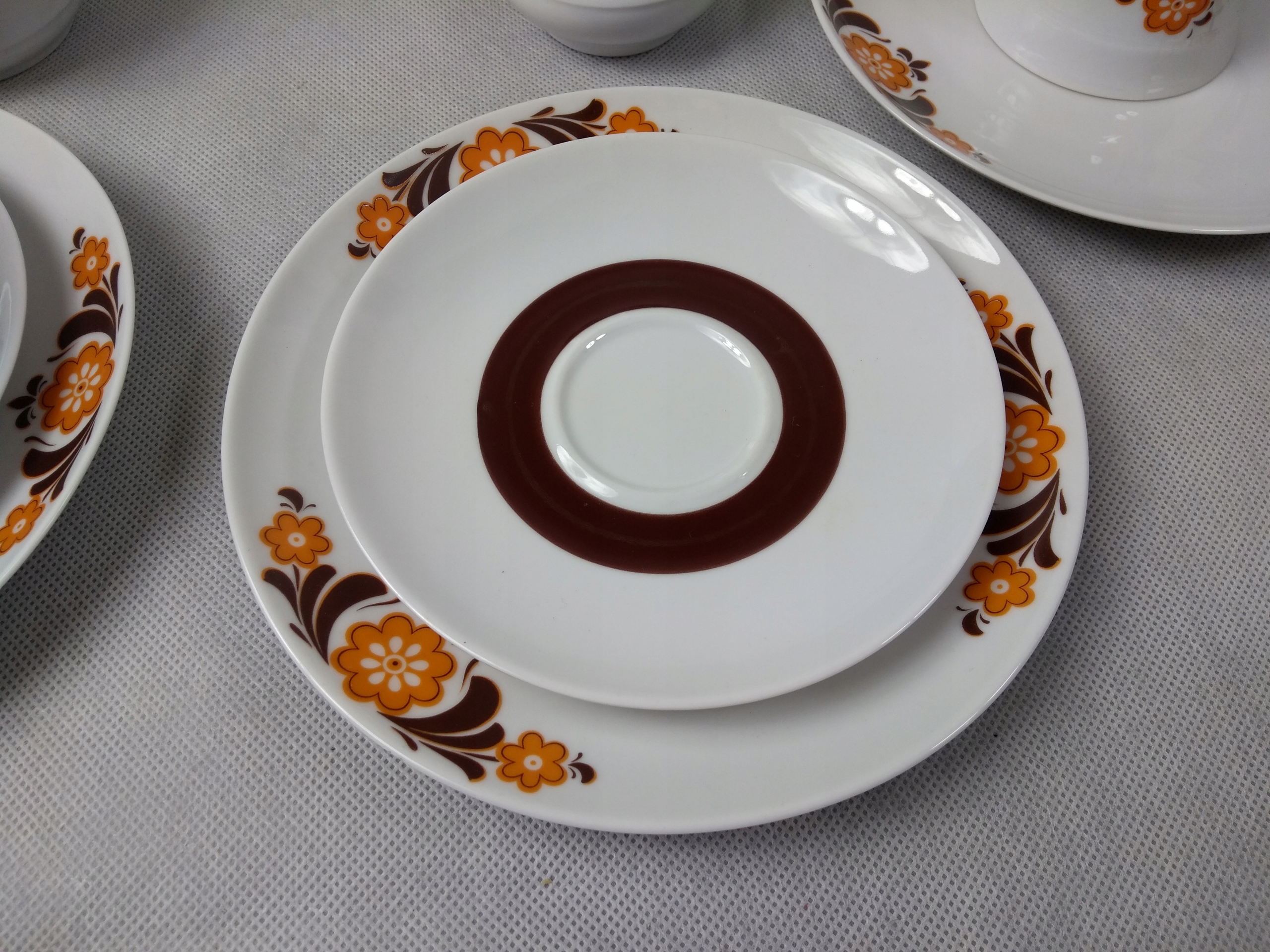 Белый фарфор, украшенный узором оранжевой и коричневой краской.