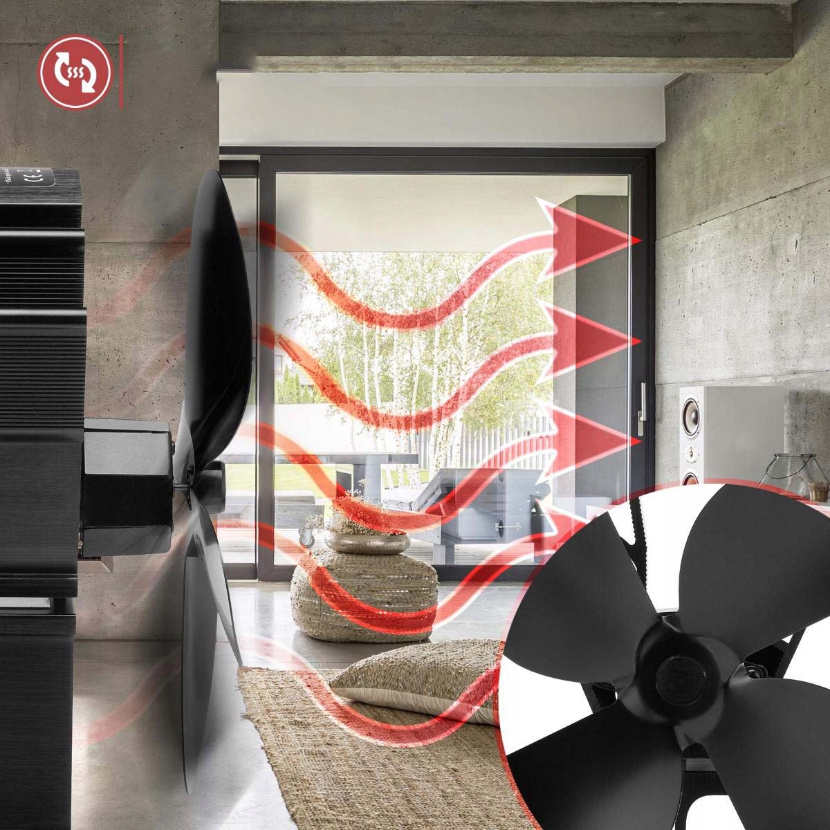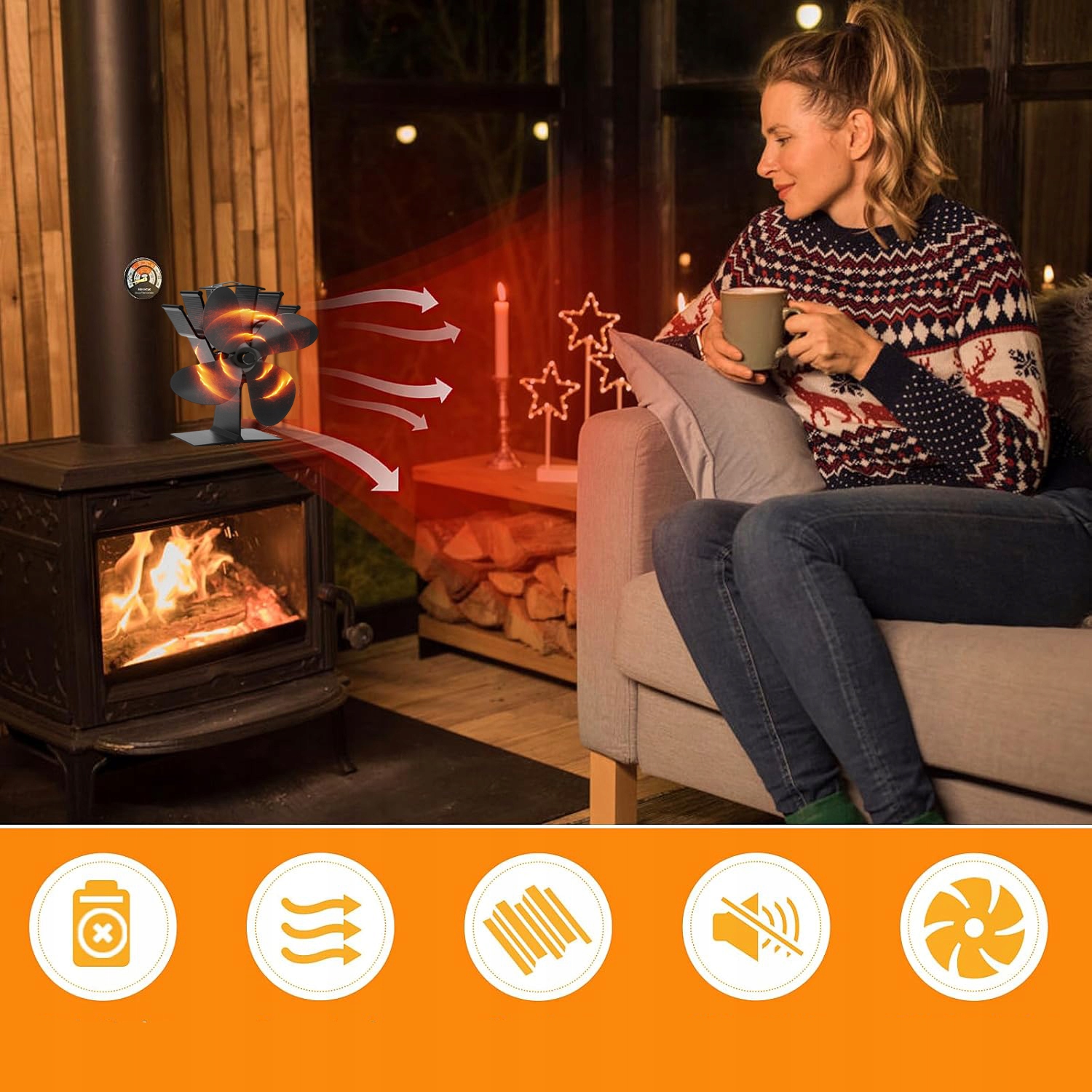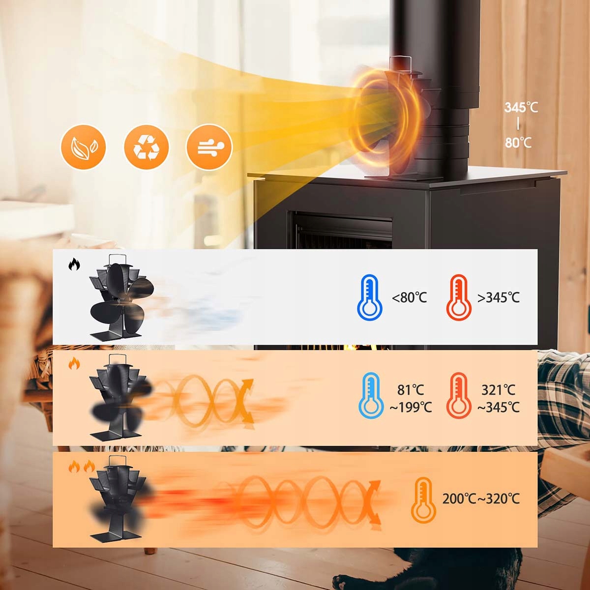 - 4-лопастной вентилятор для дровяной печи в использовании. Человек сидит у зажженной дровяной печи в хижине. Функции вентилятора выделены значками.