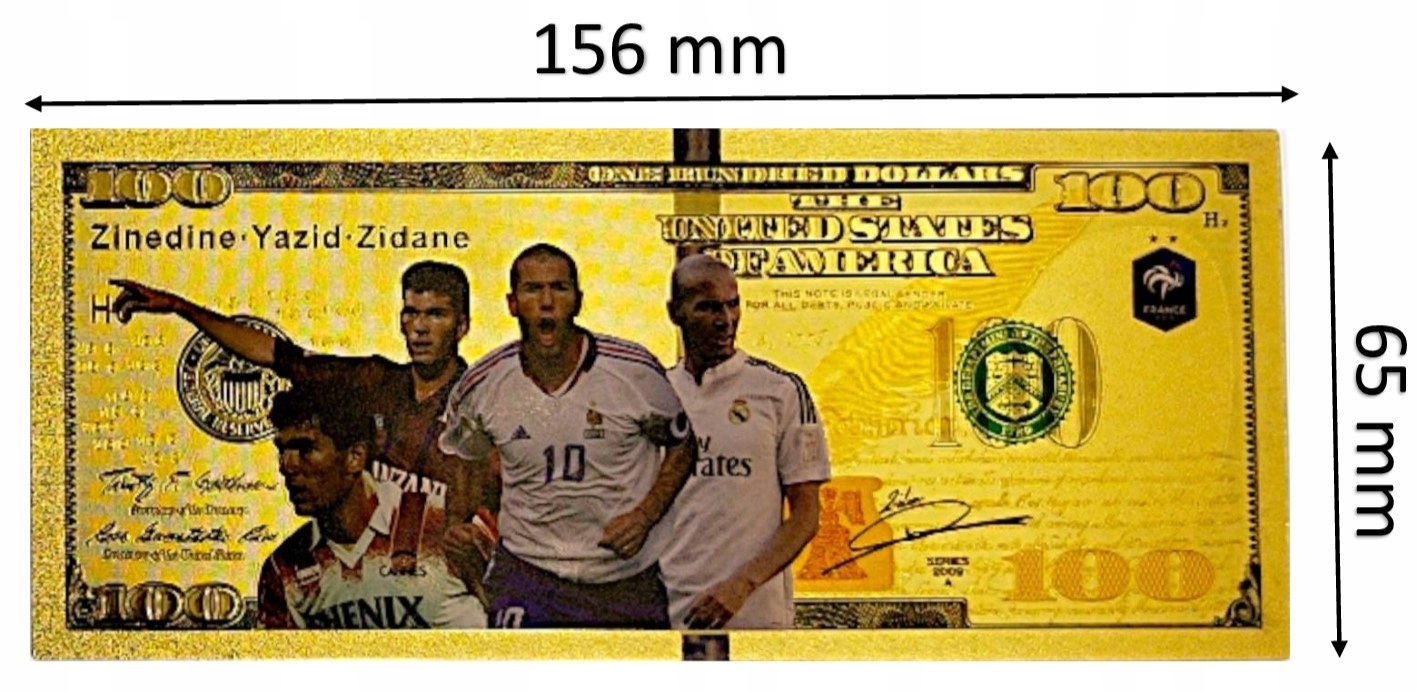 прекрасно сделано из банкноты из ПВХ с изображением Zinedina Zidane золотой, покрытой золотой фольгой. Циркуляция