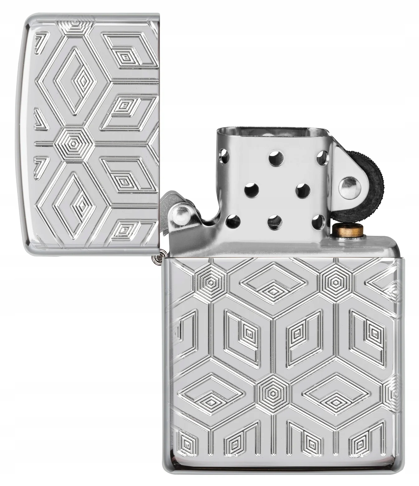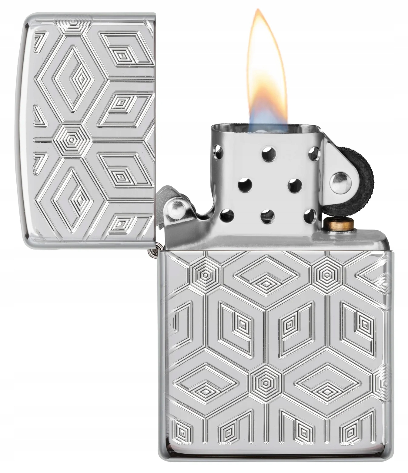 Base Armor® High Plack Chrome был украшен геометрической моделью, изготовленной с использованием многоточной методики 360 - продвинутая с помощью метода глубокого фрезерования, в которой мощный фрезерный аппарат создает изогнутые порезы, что дает зажигалку эффект визуального визуального эффекта.