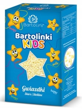 Bartolinki Kids — яичная паста с простыми и короткими ингредиентами. Паста имеет звездообразную форму, что привлекает детей и взрослых к ее употреблению. Его небольшая и интересная форма позволяет легко зачерпывать ложкой. Макароны добавят вкуса и разнообразия классическому томатному или молочному супу.