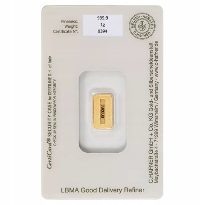 Золотой слиток весом 1 грамм представляет собой инвестиционный продукт от известного производителя драгоценных металлов К. Хафнера и является идеальным выбором для инвесторов, которые ищут физический актив стоимостью престижный характер. Золотой слиток изготовлен из чистого золота 999,9 пробы и имеет сертифицированную защиту CertiPack. Стоит добавить, что эмитент золотого слитка аккредитован LBMA, благодаря чему предоставляет на свою продукцию максимально возможную гарантию качества.