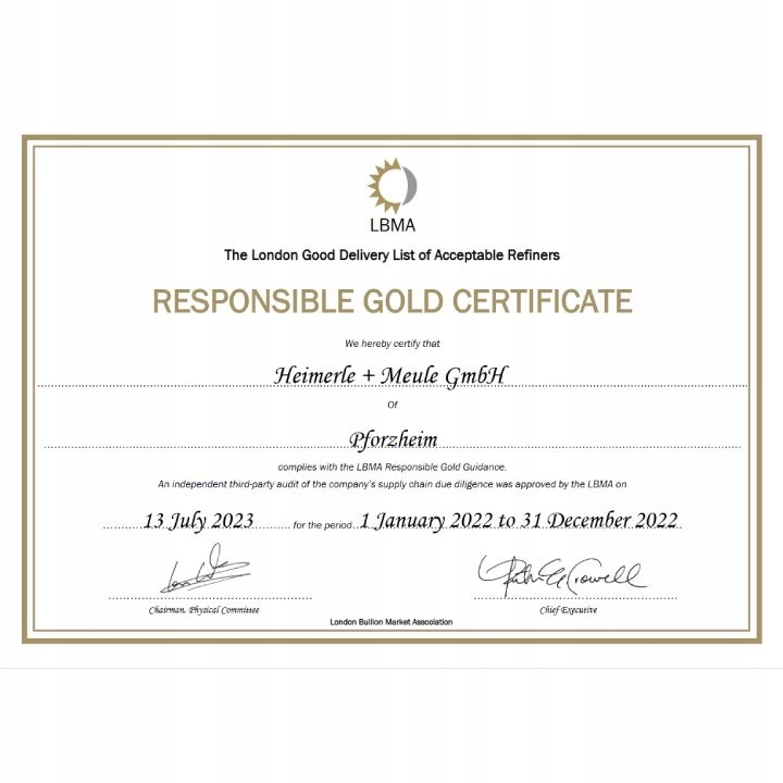 Золотой слиток весом 2,5 грамма представляет собой инвестиционный продукт от известного производителя драгоценных металлов Heimerle Meule и является идеальным выбором для инвесторов, которые ищут физический актив престижного характера. Золотой слиток изготовлен из чистого золота 999,9 пробы и имеет сертифицированную защиту CertiPack. Стоит добавить, что эмитент золотого слитка аккредитован LBMA, благодаря чему он предоставляет своей продукции максимально возможную гарантию качества.