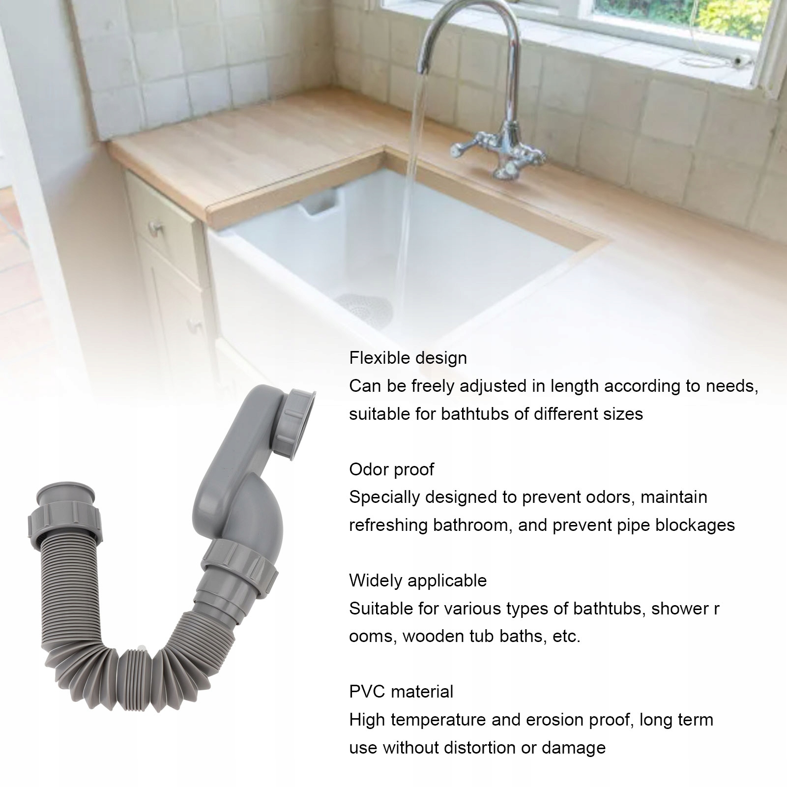 2. [Предотвращение запаха] Эта сливная труба для ванны специально разработана для предотвращения неприятных запахов, обеспечивая свежесть и чистоту вашей ванной комнаты, а также эффективно предотвращая засоры.