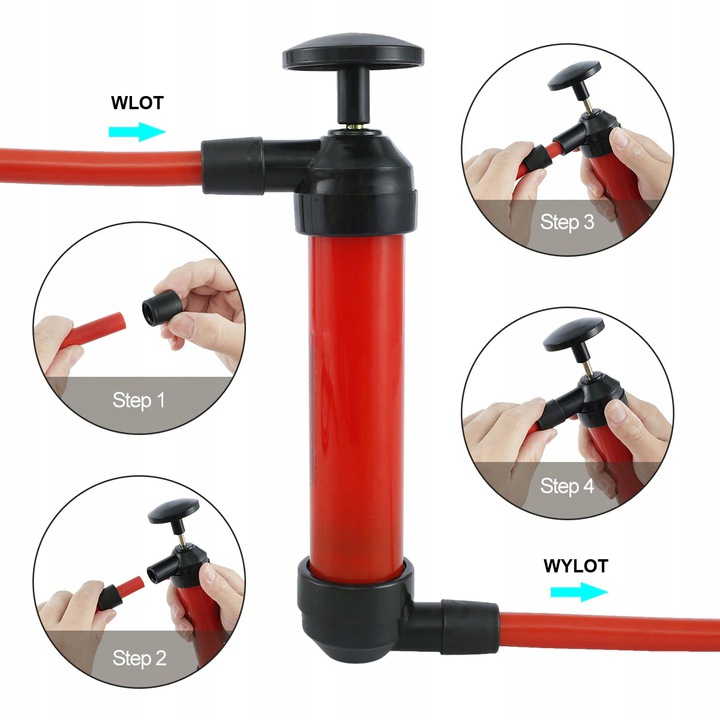 - Очень простая операция! Просто погрузите один конец жидкого кабеля в жидкость и положите выпускной шланг в контейнер и начните качать жидкость с поршнем!