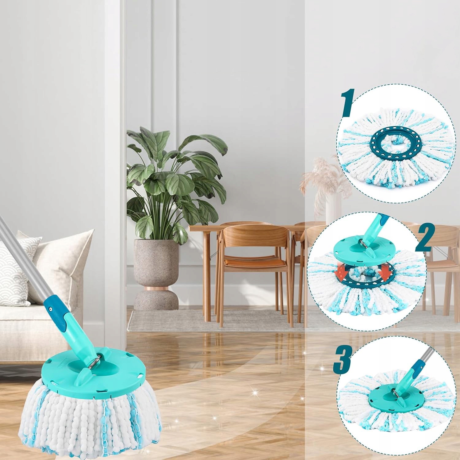 -Простота в использовании, инструменты не требуются, просто снимите старую насадку швабры и наденьте новую.