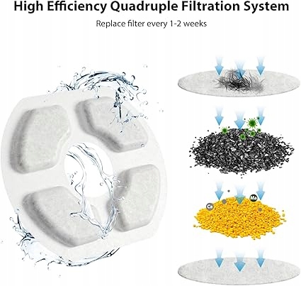 - Эффективная фильтрация: благодаря 4-слойному составу активированного угля сменные фильтры эффективно фильтруют грязь и примеси, одновременно устранение неприятных запахов из воды. Это помогает вашему питомцу пить здоровую и гигиеничную воду.