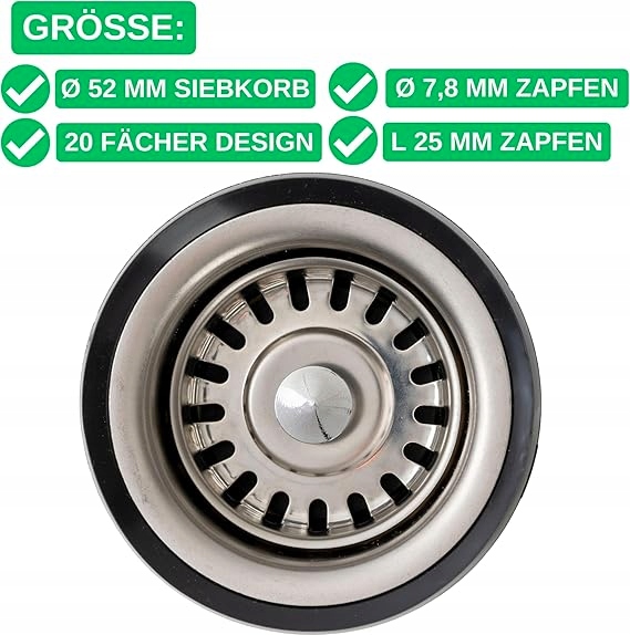 Шпилька сетчатого фильтра имеет общую длину 25 мм, штифт Ø7,8 мм и пружинный шарик Ø4,5 мм. Сливной клапан оснащен резиновым манжетным уплотнением для обеспечения плотного закрытия. Сетчатый вкладыш для вентиляционных трапов имеет внутренний диаметр Ø28 мм. Деталь разработана для комплектов Blanco, Franke, Viega, Keenberk, Wirquin и других наборов.