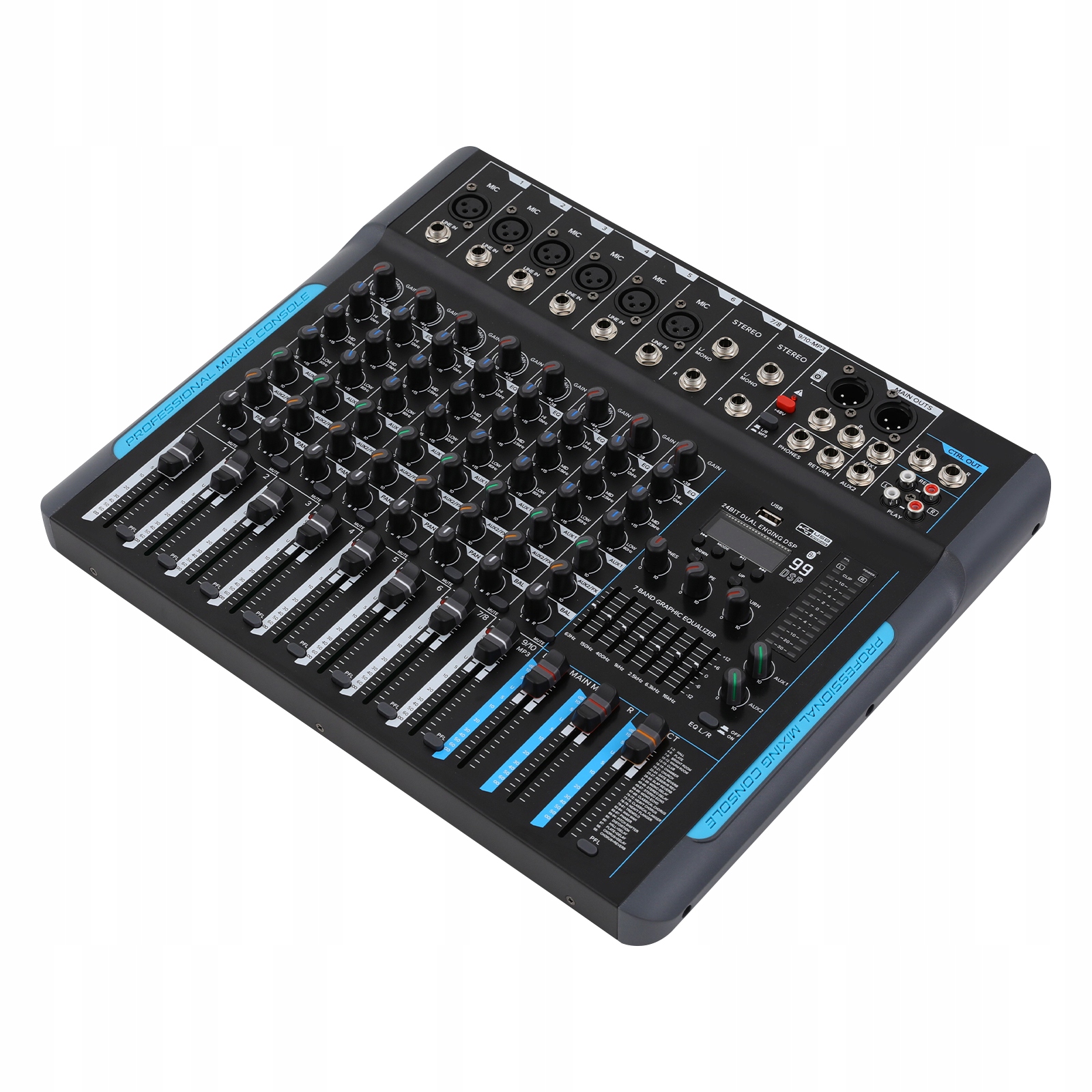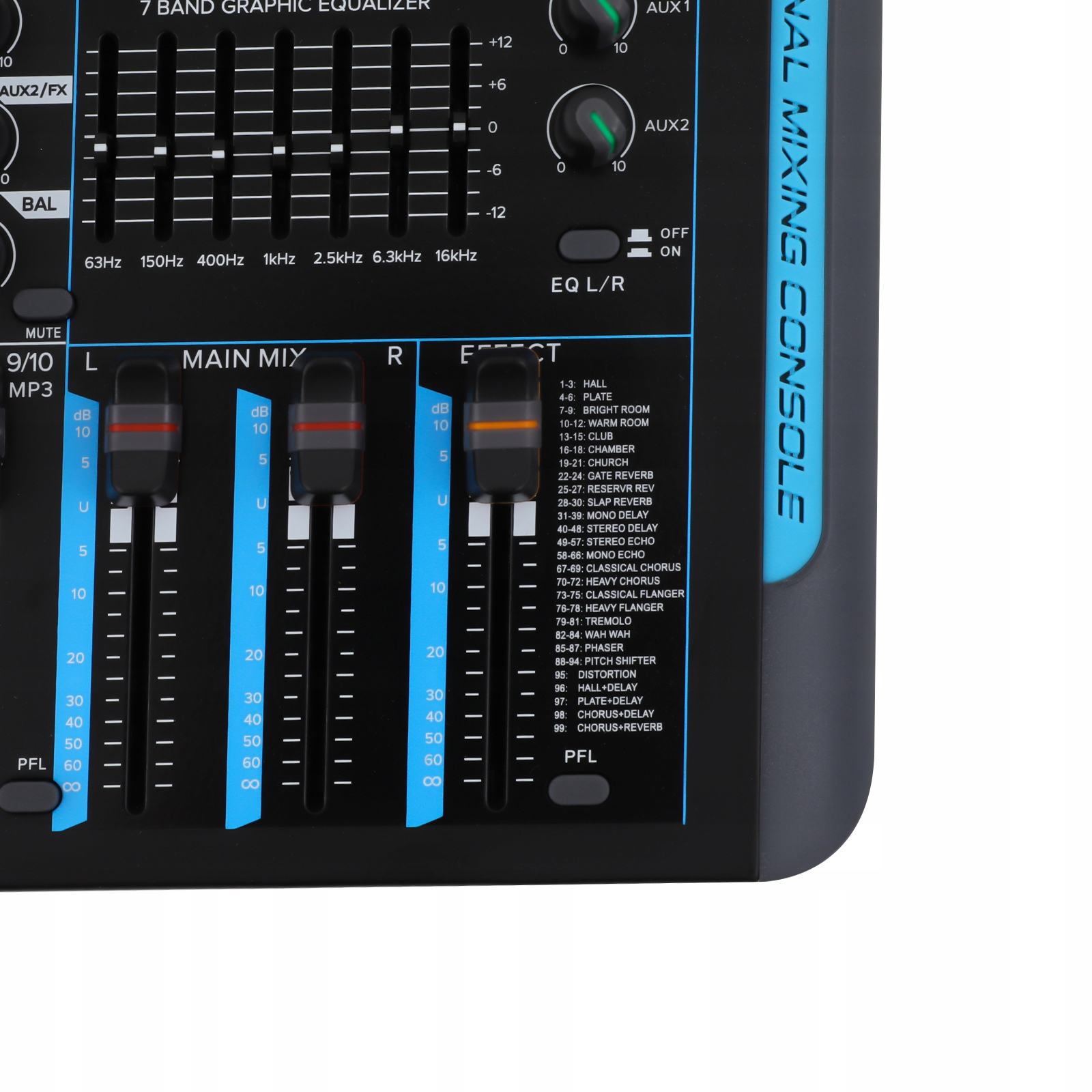 Мощная функция: Продукт имеет 10 входных каналов, что позволяет подключать различные устройства-источники звука, такие как микрофоны и инструменты, идеально подходящие для различных выступлений и записей. Кроме того, он оснащен 99 типами цифровой реверберации DSP для творческого формирования звука и 7-полосным графическим эквалайзером, а также независимым трехполосным эквалайзером верхних/средних/низких частот для точного управления частотой и оптимизации звука в зависимости от различных потребностей.