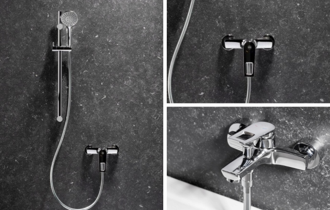 В коллекции Amazonit внимание привлекают прямоугольные вырезы в ручках смесителей.