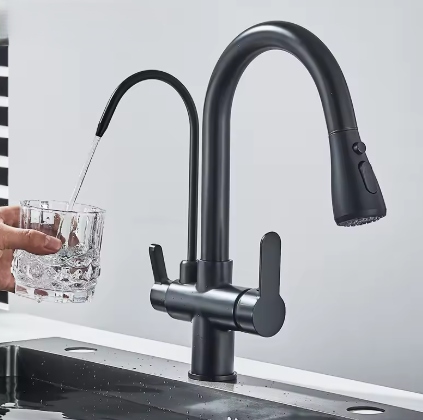 Смеситель для кухни 3-функциональный с фильтром и выдвижным изливом - черный