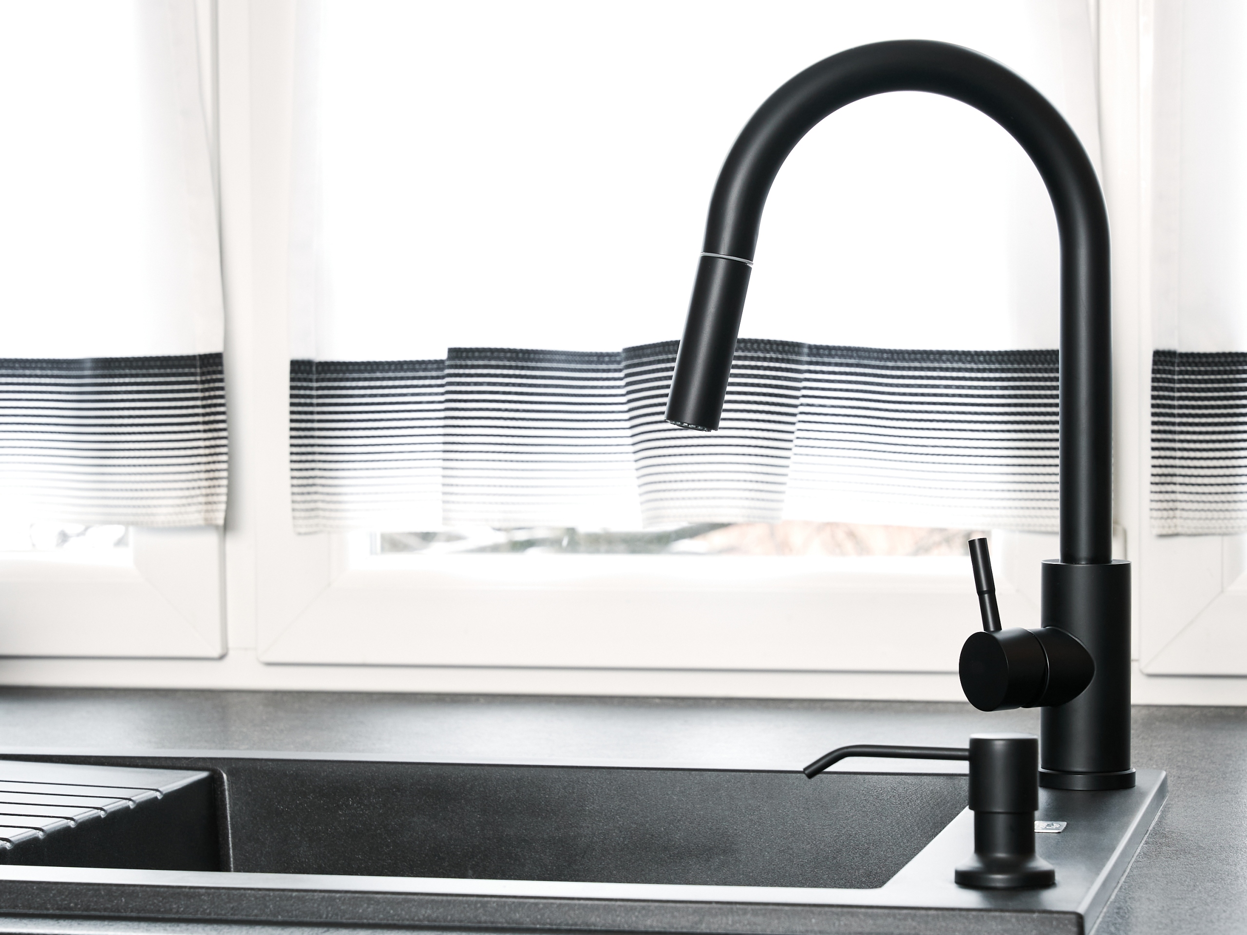 черная кухонная батарея с растянутым носом, двухфункциональный кухонный кран h1>