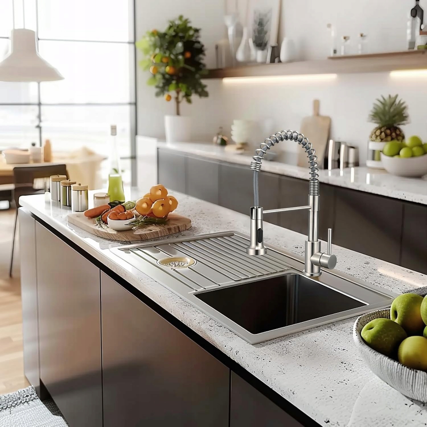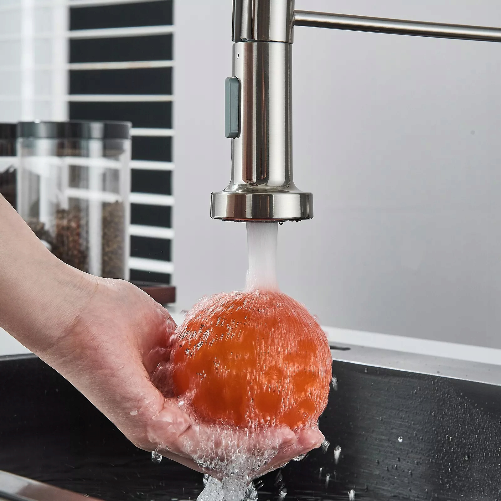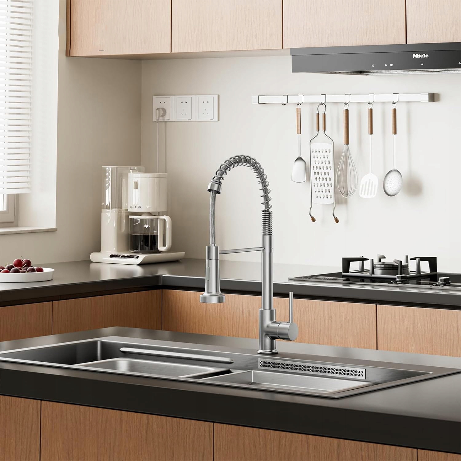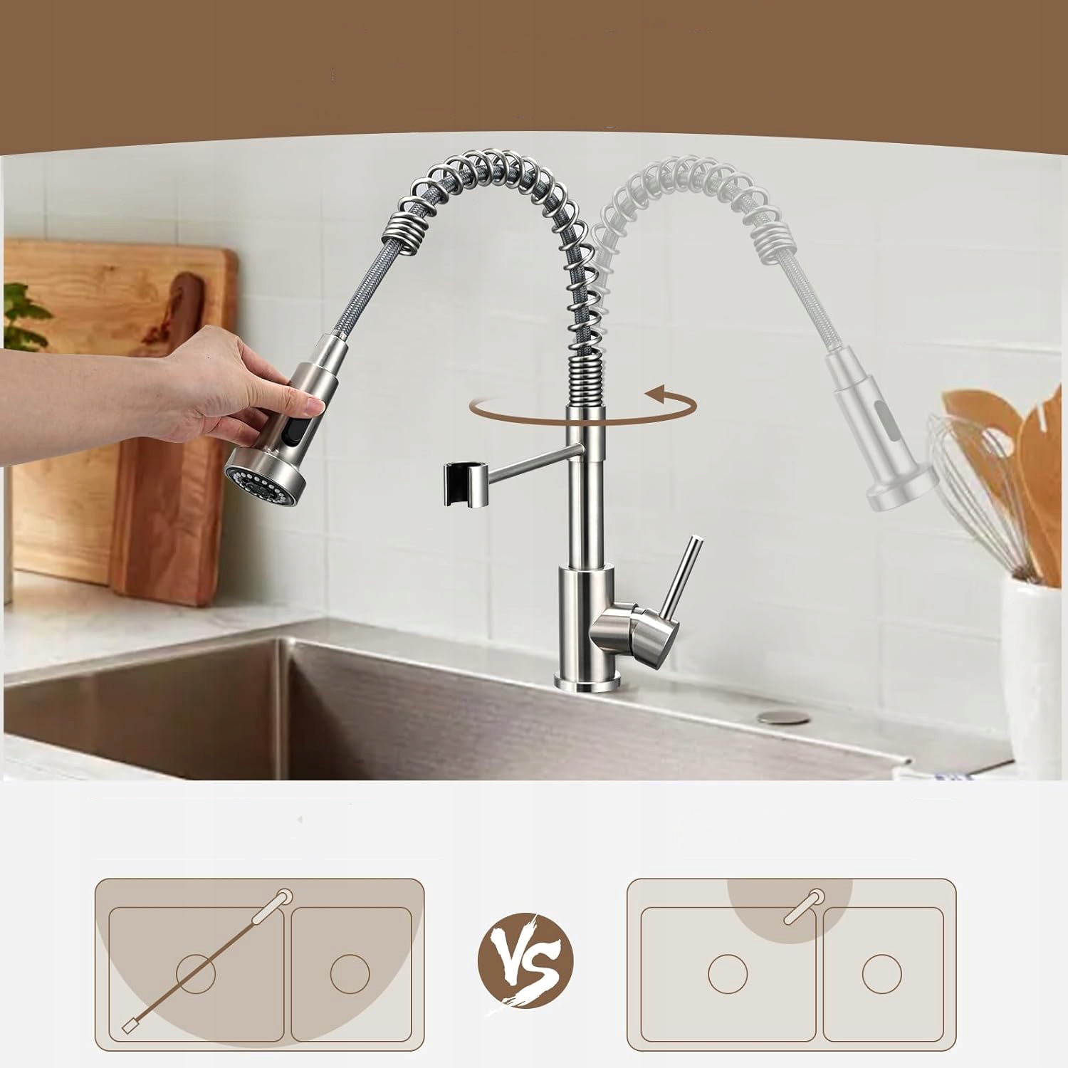 🚰🚰🚰[Идеально подходит для вашей кухни] Смеситель для кухни с высокой аркой и открытой пружиной сочетает в себе коммерческий стиль с тщательно разработанными инновационными технологиями, что делает его идеальным дополнением к любому дому. Изысканная отделка из нержавеющей стали отражает красоту приборов из нержавеющей стали, создавая гладкий, изысканный и удобный вид, который дополнит любой кухонный декор.