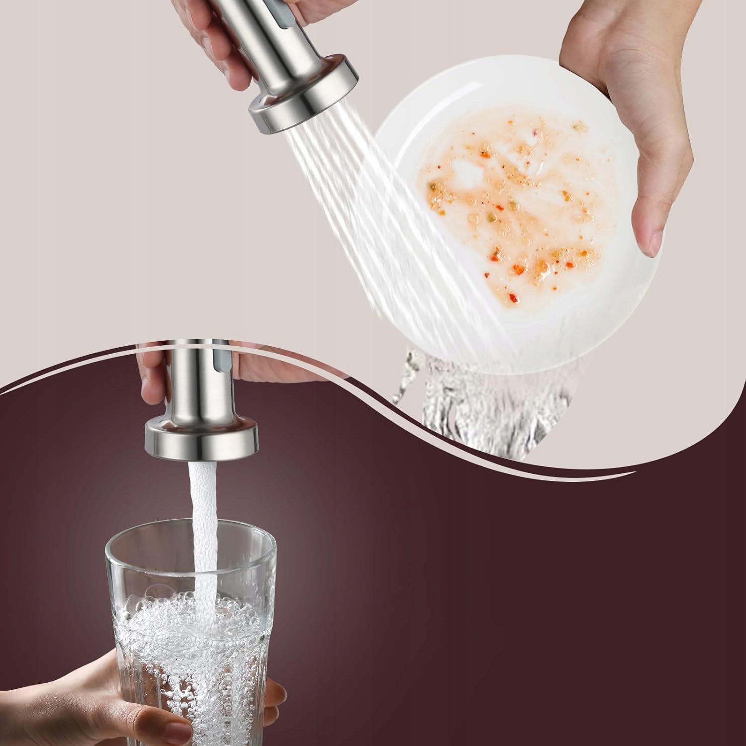 Двухфункциональная распылительная головка с кулисным переключателем позволяет легко менять струю от газированной до мощной, обеспечивая широкий спектр применения: от ополаскивания овощей до интенсивной чистки.