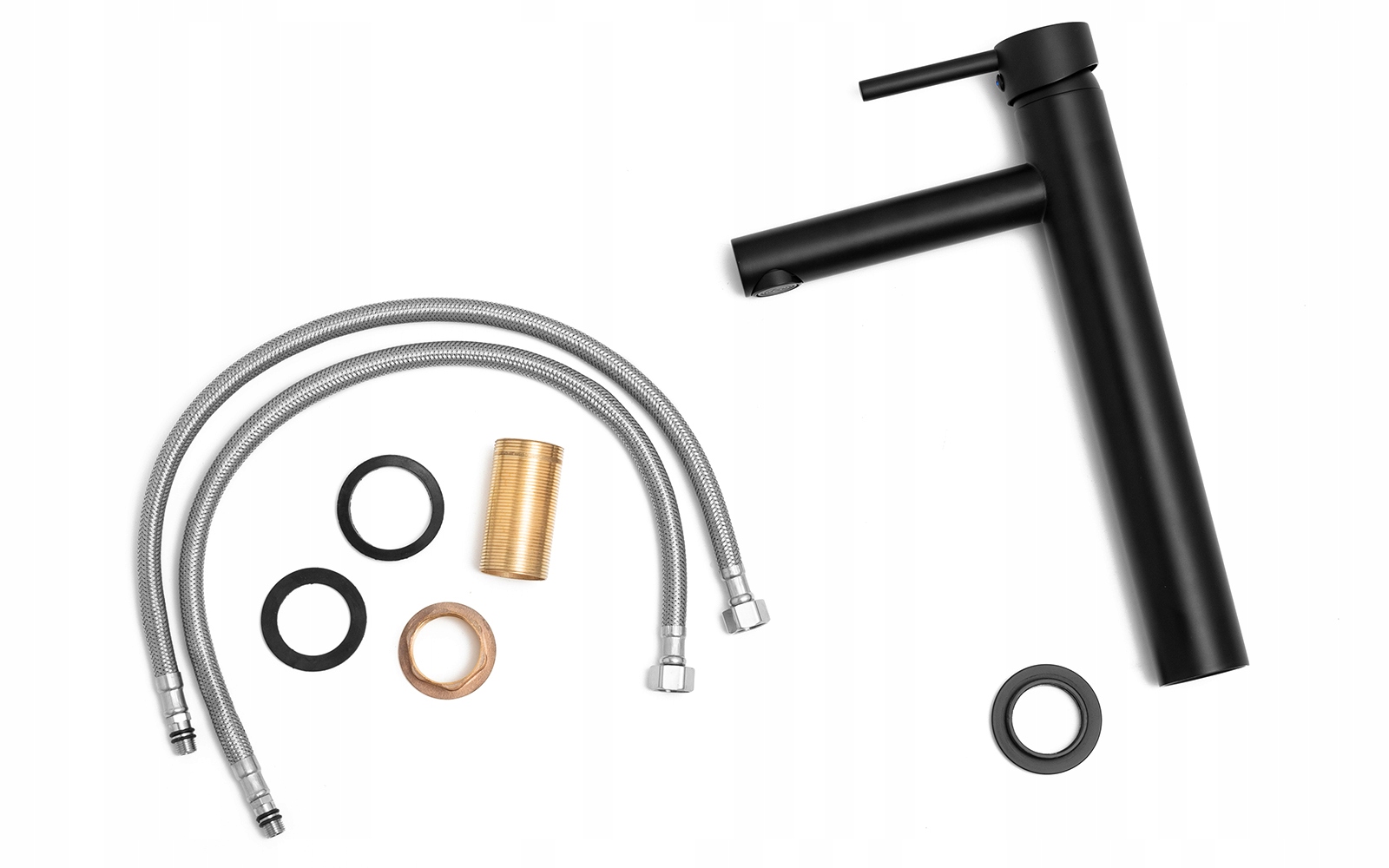 В комплект входят 2 высококачественных шланга в нержавеющей оплетке длиной 50 см со стандартным соединением 3/8 дюйма и комплект аксессуаров для монтажа смесителя.