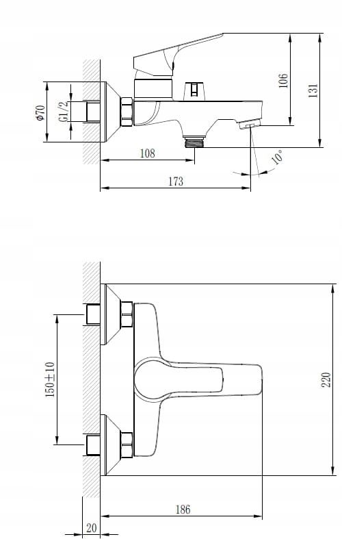 - Место установки смесителя для душа СТАНДАРТ< /li> b>: 15 см