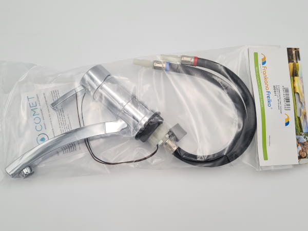 Однорычажный смеситель Comet Capri имеет привлекательный и современный дизайн. Яркий дизайн в сочетании с современными технологиями обеспечивает высокое качество продукта. Высокая функциональность благодаря проверенной керамической вставке (при необходимости заменяемой). Легко очищаемая поверхность, съемный слив для воды со стандартным ключом для очистки, предназначенным для удаления накипи. Смеситель имеет гибкие соединительные шланги длиной около 34 см и диаметром 1 см. Излив широко используется в фургонах и кемперах.