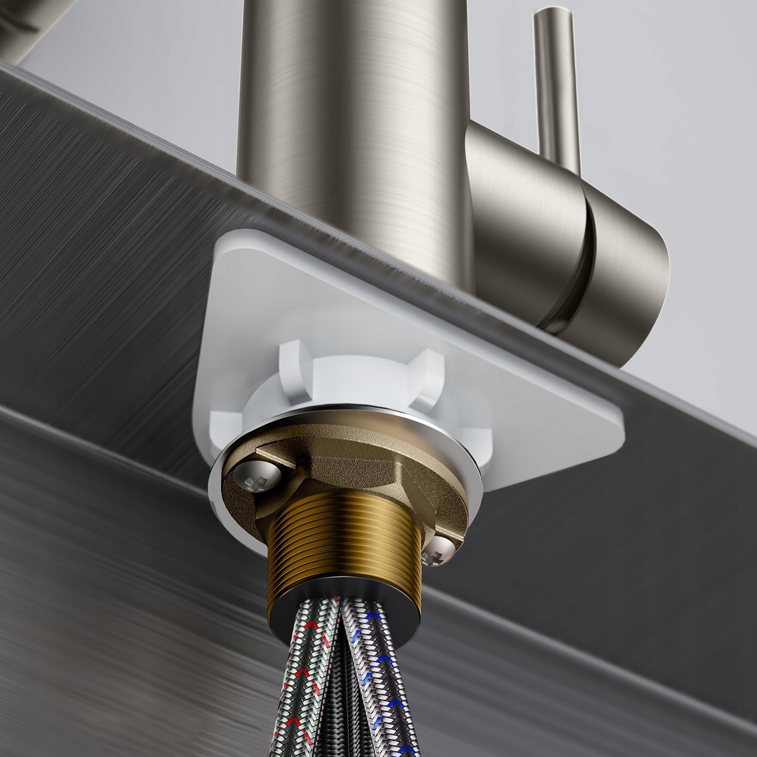 Изготовленный из высококачественной нержавеющей стали 304, он очень прочный и устойчивый к коррозии. Нержавеющая сталь 304 не только эффективно предотвращает ржавчину и коррозию, но также обладает устойчивостью к царапинам и истиранию, поэтому ваш кухонный смеситель не будет поврежден или деформирован после длительного использования.