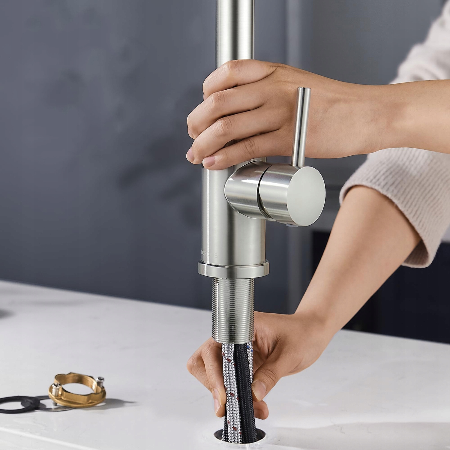 Этот смеситель для кухни отличается простой конструкцией и легкостью установки, не требующей использования профессиональных инструментов. Подходит для большинства стандартных моек и идеально подходит как для домашних, так и для коммерческих кухонь. В комплект входят полные аксессуары для сборки, что позволяет сэкономить дополнительные расходы.