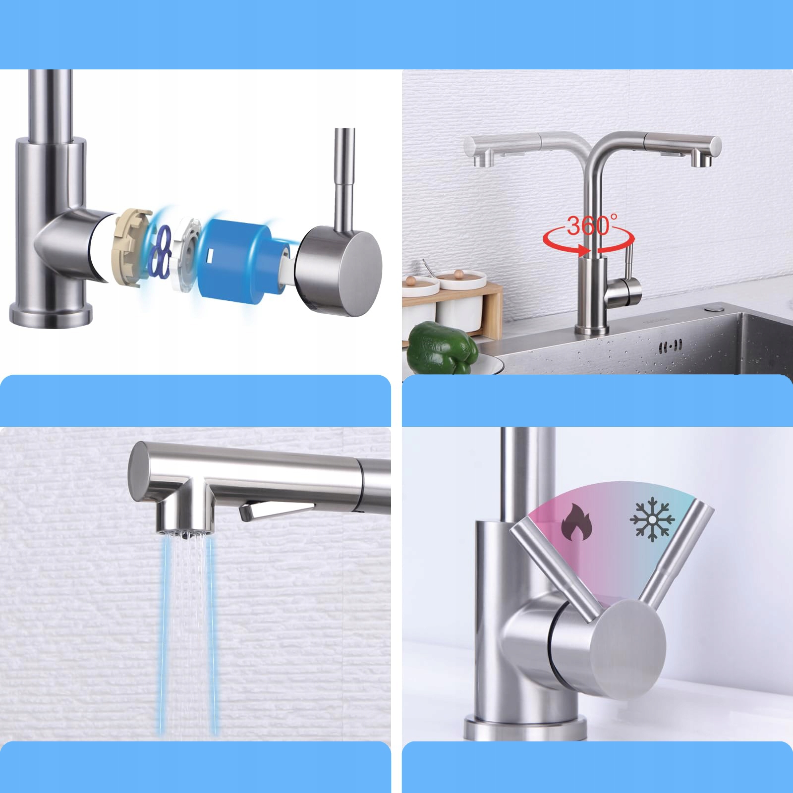 Функция вращения на 360 градусов значительно повышает удобство использования кухонного смесителя. Вы можете свободно вращать его и легко регулировать направление потока воды, чтобы смеситель покрывал всю раковину и удовлетворял различные потребности в очистке.
