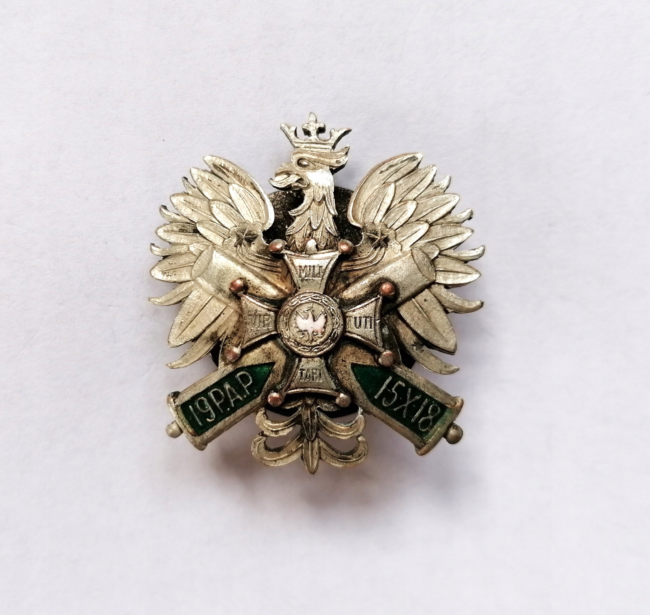 Значок 19 -го полевого артиллерийского полка от Вильния в офицерской версии. Два -значок, эмалированный и серебряный. Размеры: 35 x 32 мм. Фотографии показывают фактическое состояние предмета.