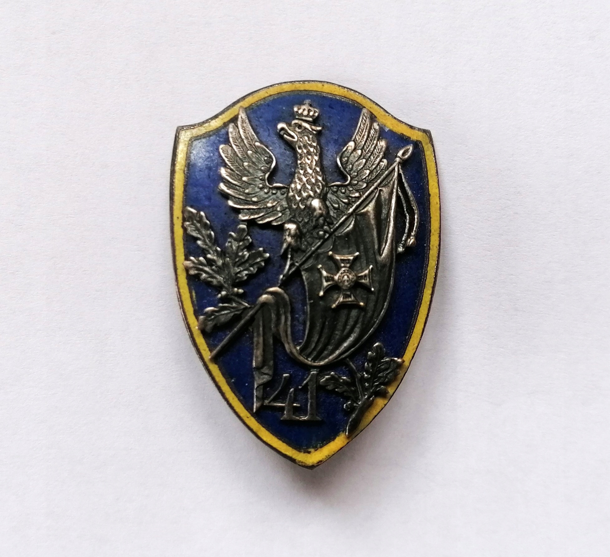Значок 41 -го пехотного полка от Сувалки в версии офицера. Двухнологичный значок, эмалированный, серебряный и подписанный. Размеры: 46 x 32 мм. Фотографии показывают фактическое состояние предмета.