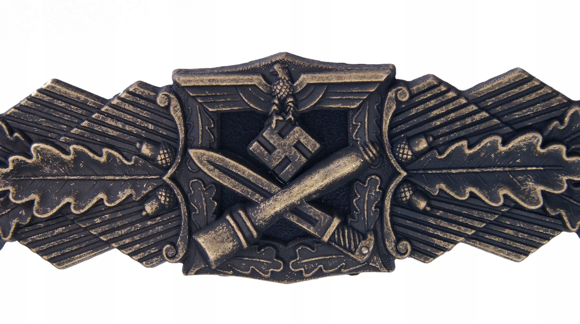 Точная копия немецкого украшения Nahkampfspange — так называемого Шлепки для рукопашного боя. Реплика изготовлена из твердого металла методом высечки, а не отлита. Коричневый спандекс.