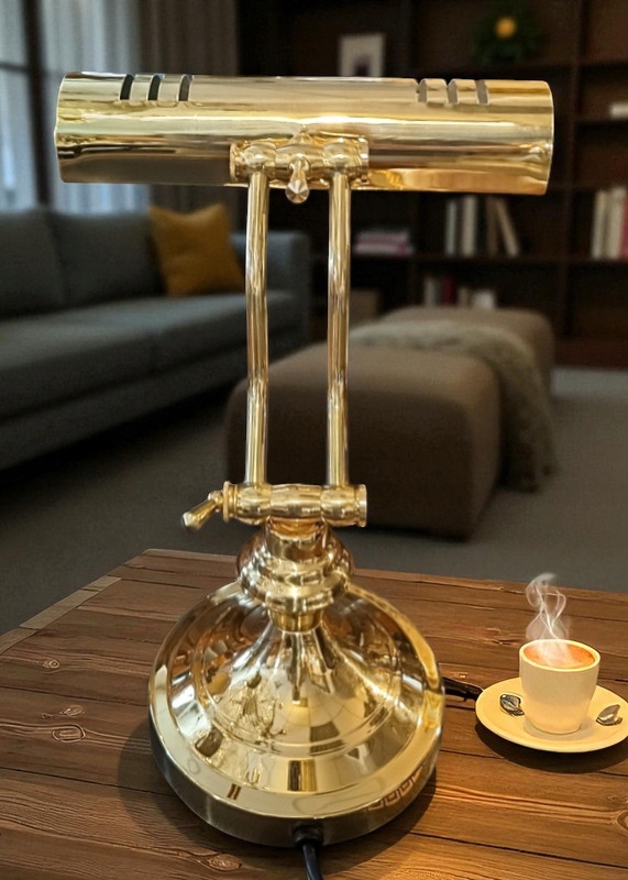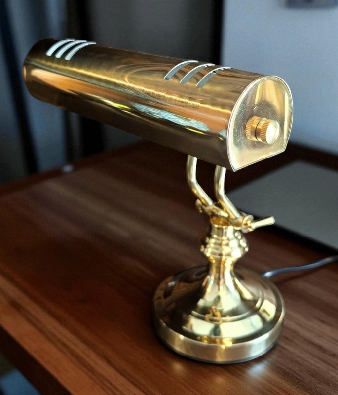 Эта выставка -это так -надоедливое; Очень престижное и элегантное настольное освещение, часто встречается, например, В офисах адвоката, библиотеках, офисах и т. Д. Лампа имеет латунную лампу и латунь, твердую, например, нить).