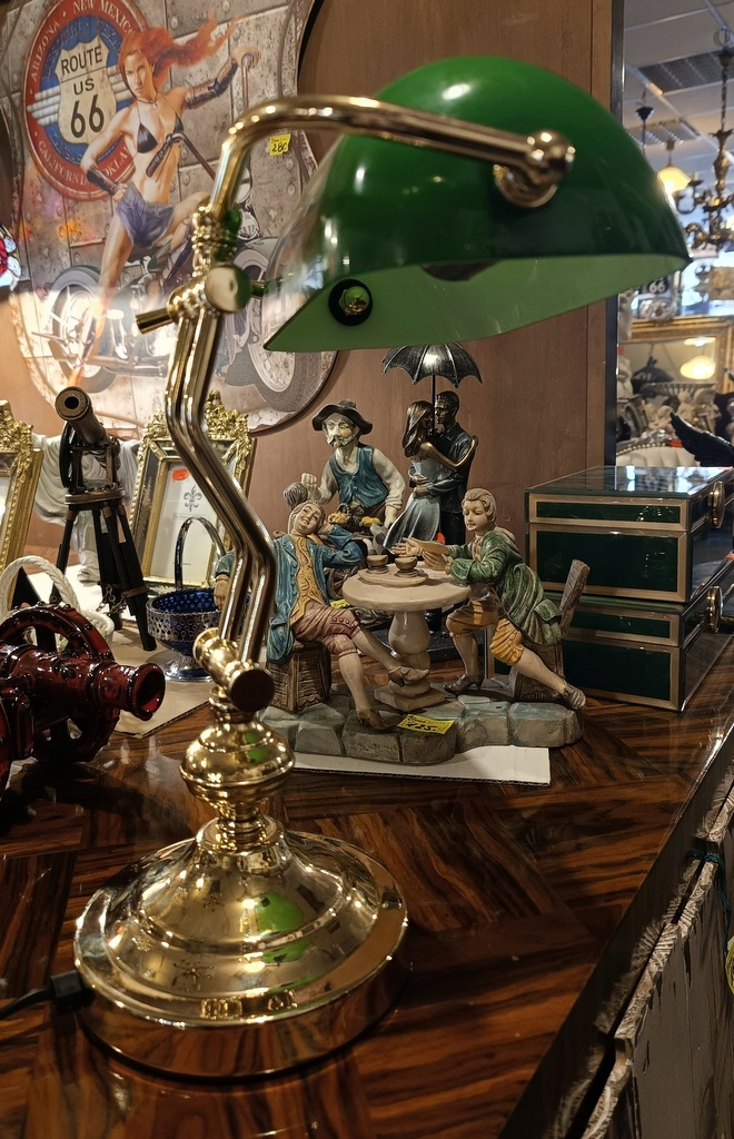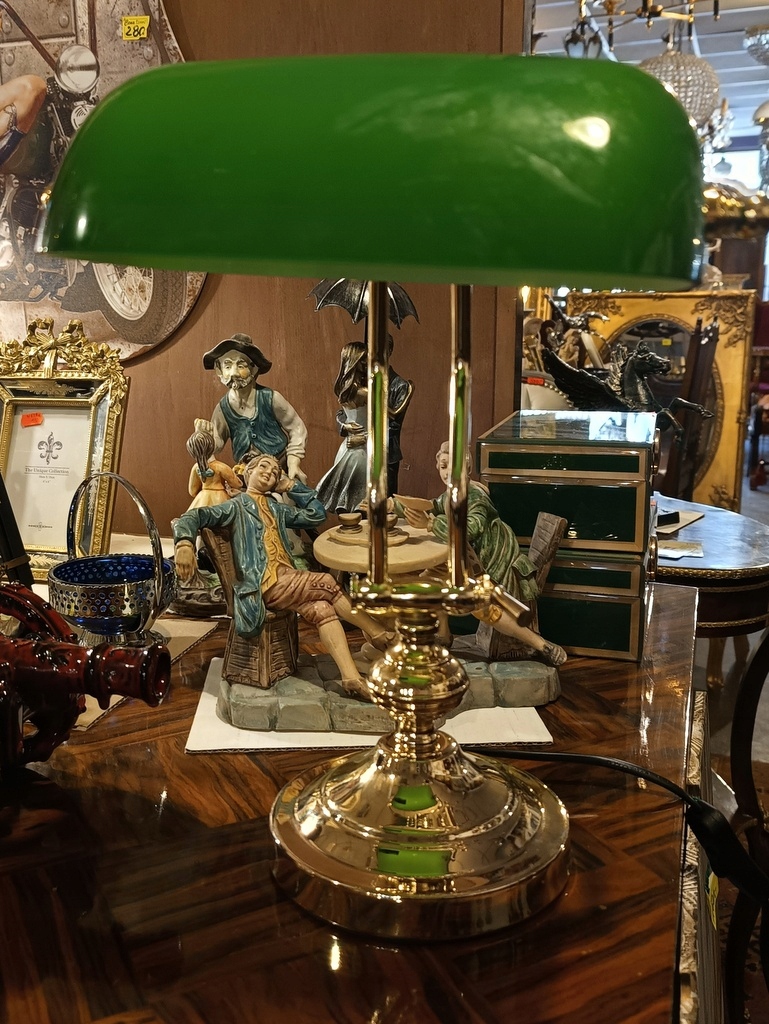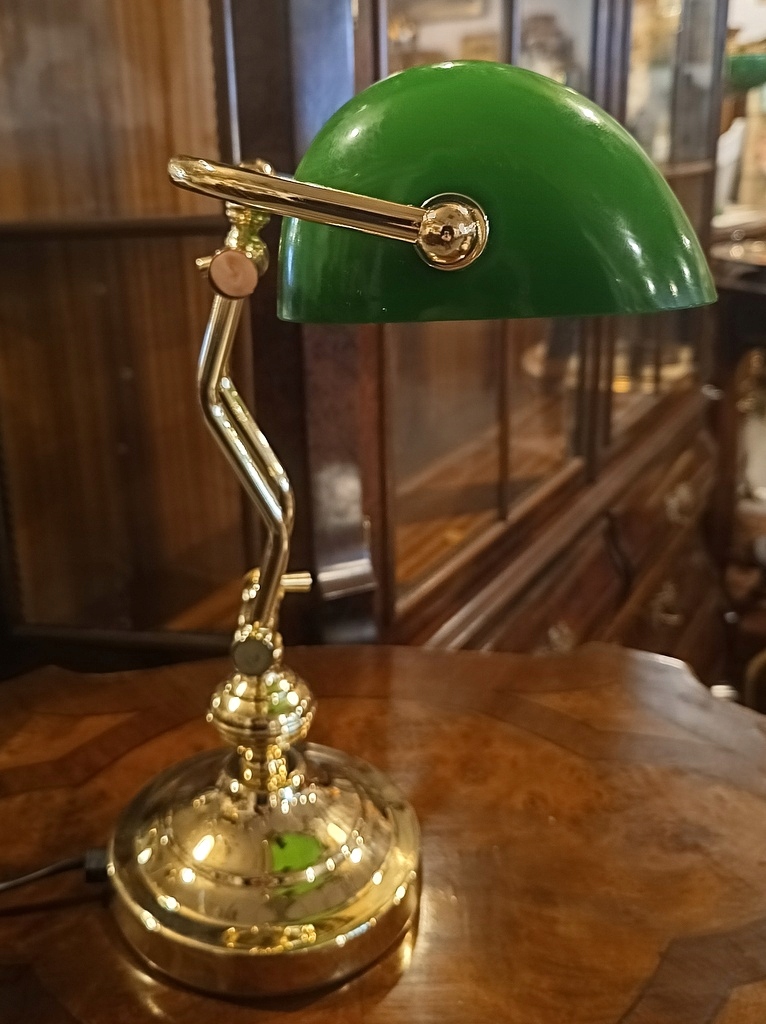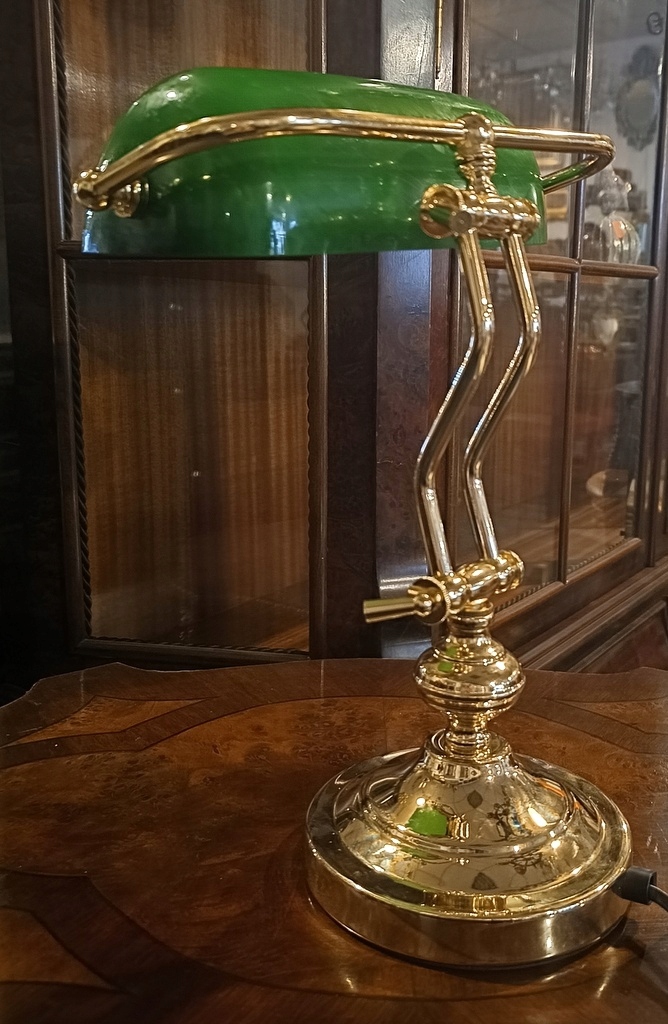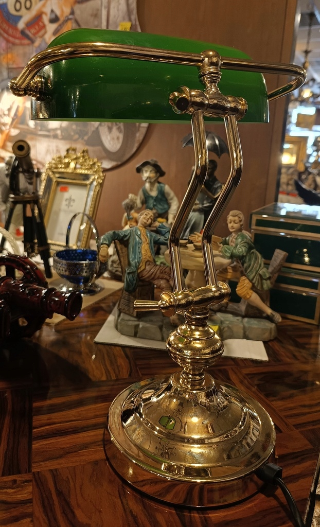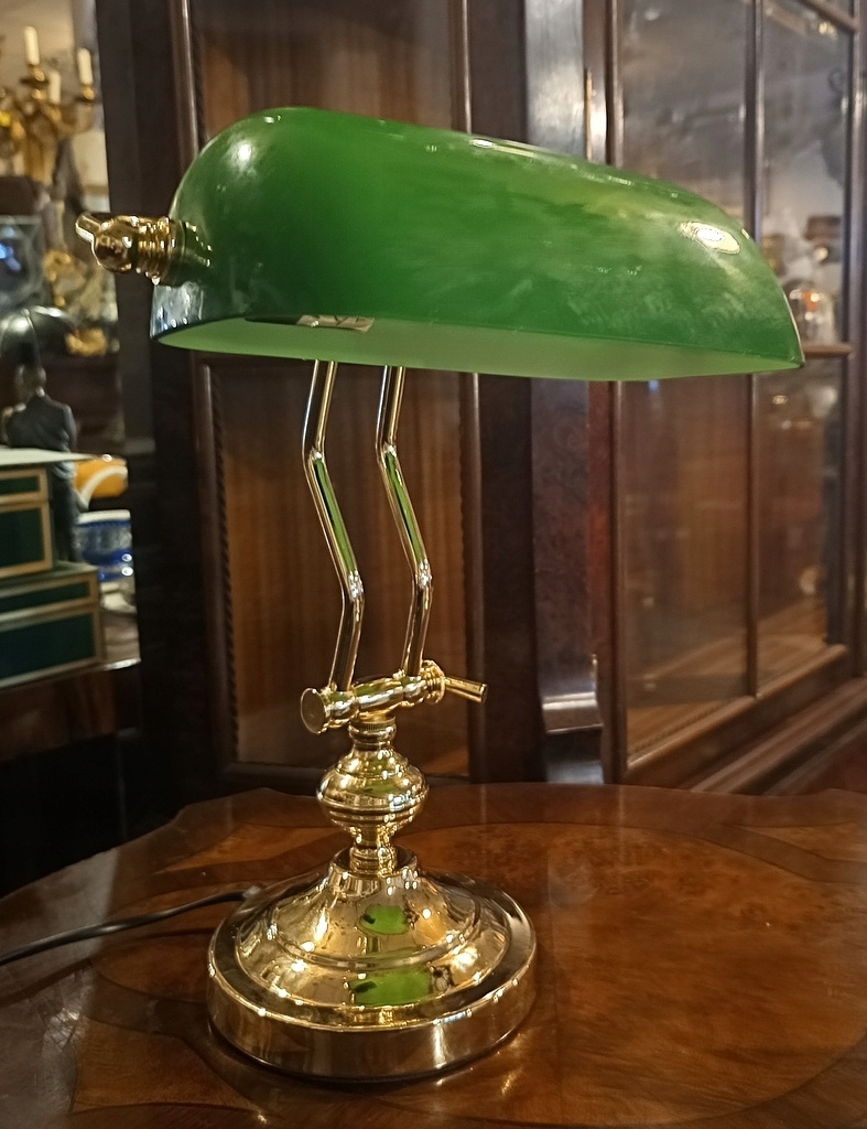 Этот экспонат – так называемый банковское дело; очень престижное и элегантное настольное освещение, часто встречающееся в юридических кабинетах, библиотеках, офисах и т. д. Лампа имеет абажур из зеленого стекла и прочную латунную ножку.