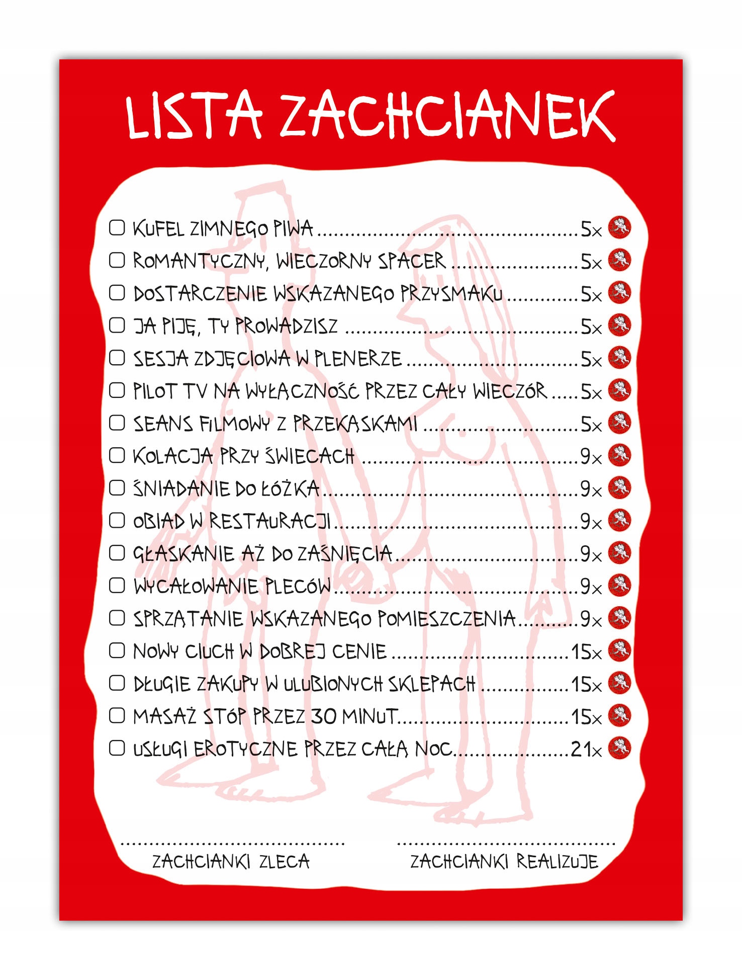 Игра впечатляет не только продуманным дизайном, но и качеством исполнения. Все компоненты изготовлены из прочного картона, который выдержит множество игр. Настоящий шарм всей игре добавляют уникальные иллюстрации Анджея Млечко, которые можно считать малым прикладным искусством. Вы можете узнать характерный стиль иллюстратора, которому знакома ирония в сочетании с юмором. Повседневные ситуации представлены в забавной форме, которая понравится каждому игроку. Все элементы игры, в том числе связанные с мужско-женской тематикой, представлены сбалансированно и привлекательно. Вам точно не будет стыдно показать игру своим друзьям и близким.