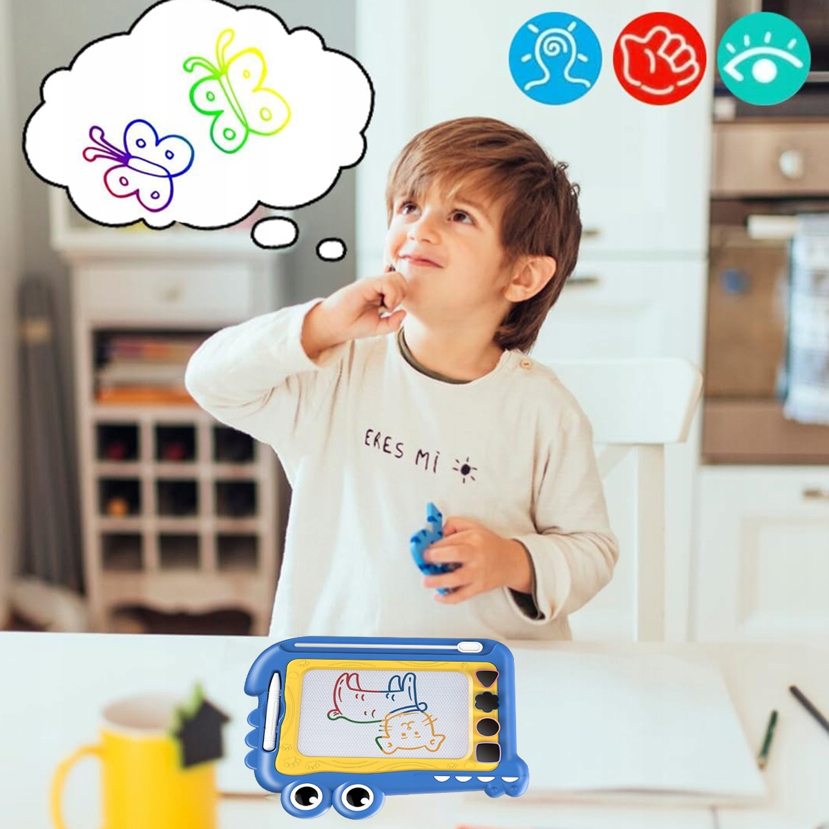 Наша волшебная доска для детей-фантастический инструмент для обучения и развлечений для детей в возрасте 2-7 лет. Он поддерживает развитие художественных способностей и воображения, а также концентрации и терпения. Четыре красочных поверхностях рисования и свободный, творческий дизайн стимулируют творческое мышление ребенка. Магнитная чертежная доска-лучшая образовательная игрушка для детей в возрасте 2-7 лет и ценная инвестиция для дома или детской комнаты.