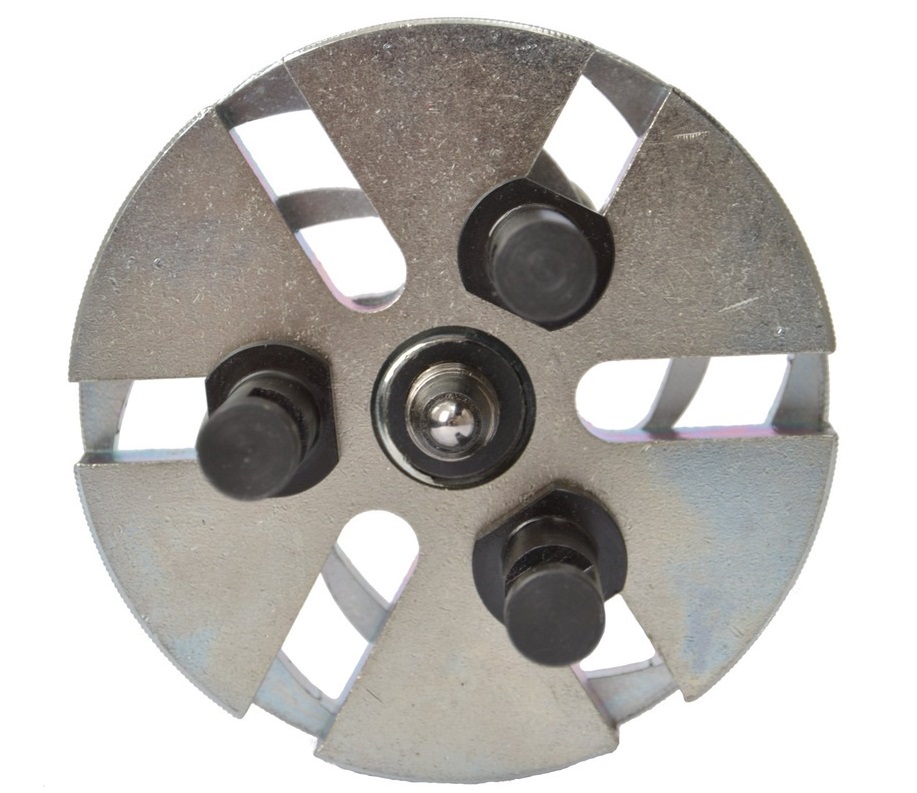 Специальная конструкция этого съемника позволяет рычагам раздвигаться симметрично за один оборот верхнего диска.