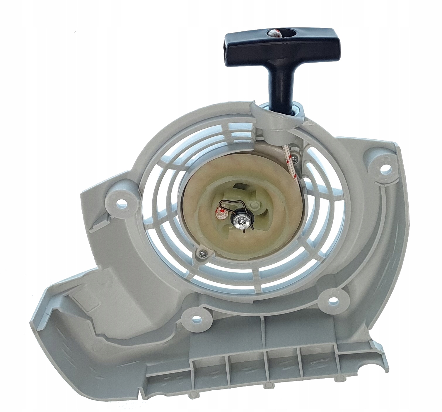 Стартер в сборе - включает в себя все элементы, показанные на фото - крышку, шкив, трос, держатель троса стартера, возвратную пружину, винт.
