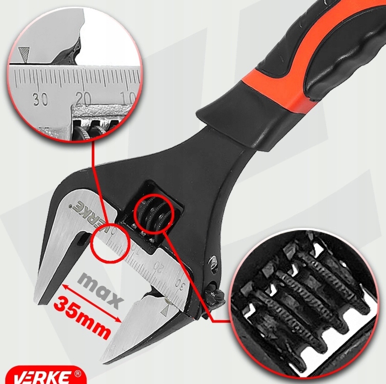 Регулируемый ключ с расширенным диапазоном интервала с челюстями (по сравнению со стандартными в этом размере). Изготовленный из хромовой стали (CR-V), используемый хром гарантирует коррозионное сопротивление, окисление, истирание и высокую прочность при высокой температуре, в то время как дополнение ванадия также влияет на устойчивость к высоким температурам и не деформируется. Лазерная измерительная чашка гарантирует читаемость, не беспокоясь о шкале. Обработка пластиковой, устойчивой к масле и смазке.