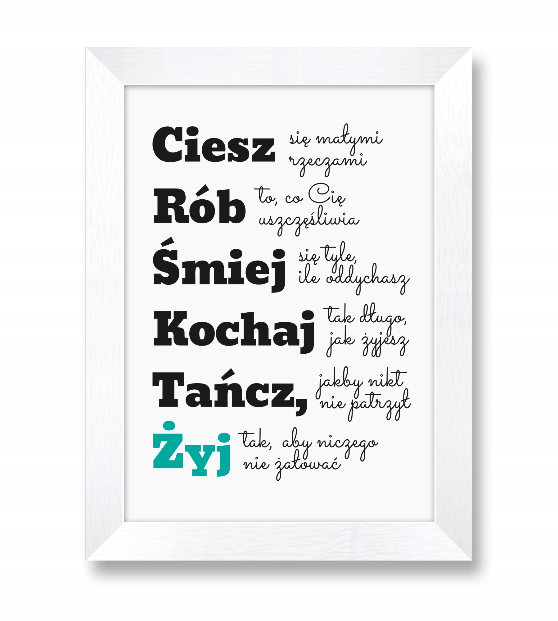 Предлагаю картину в раме под дерево со стильной надписью "Наслаждайся мелочами, делай то, что доставляет тебе удовольствие (...)"с бирюзовым цветовым акцентом текста.
