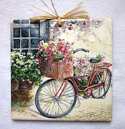 Оформление в технике декупаж, мотив закреплен несколько раз нанесенным водостойким акриловым лаком.
